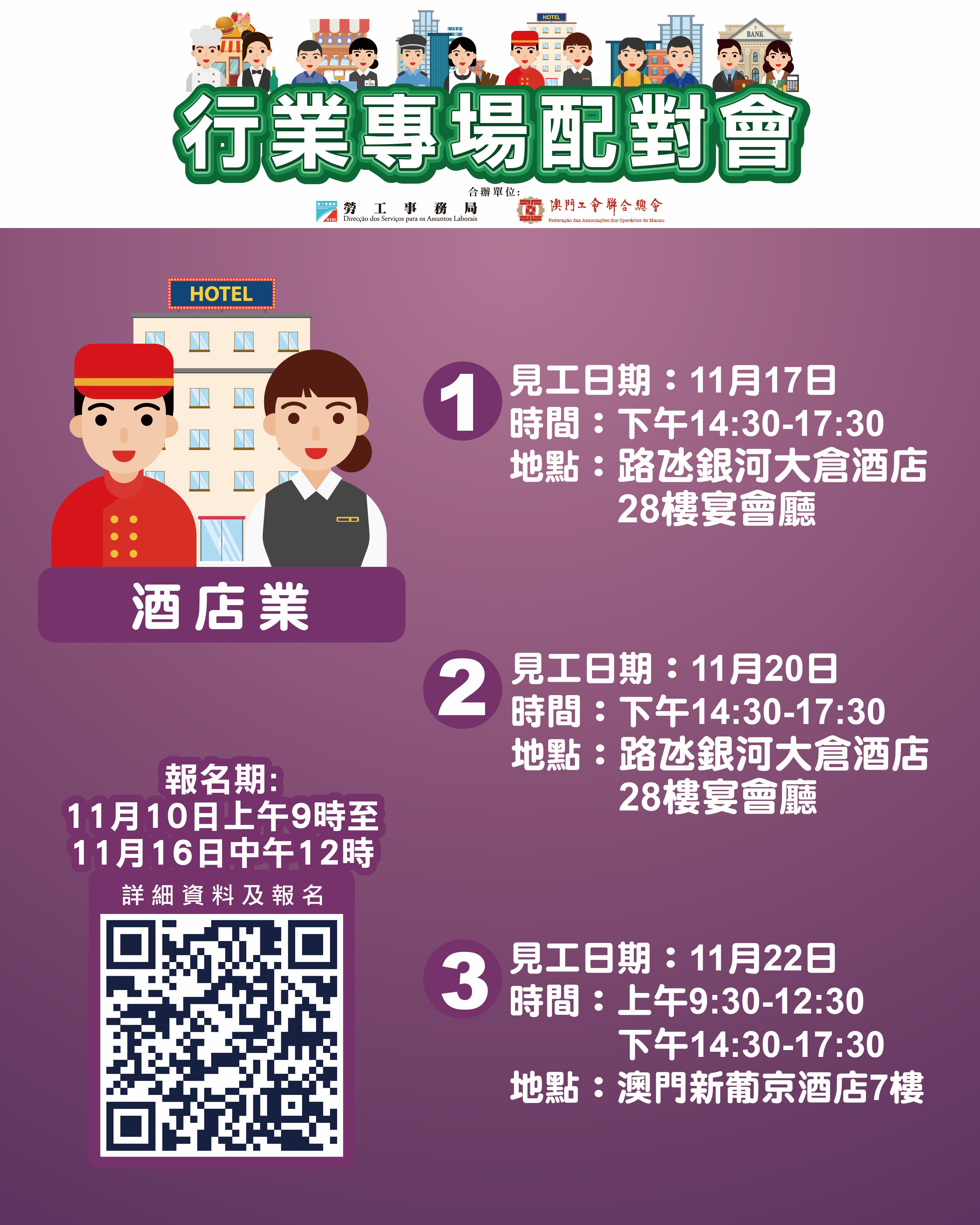 為協助有求職需求的澳門居民盡快就業,以及為緩解業界的人資需求的壓力,勞工事務局與澳門工會聯合總會合作11月舉辦3場行業專場配對會,合共提供146個空缺。報名日期為11月10日上午9時至11月16日中午12時。