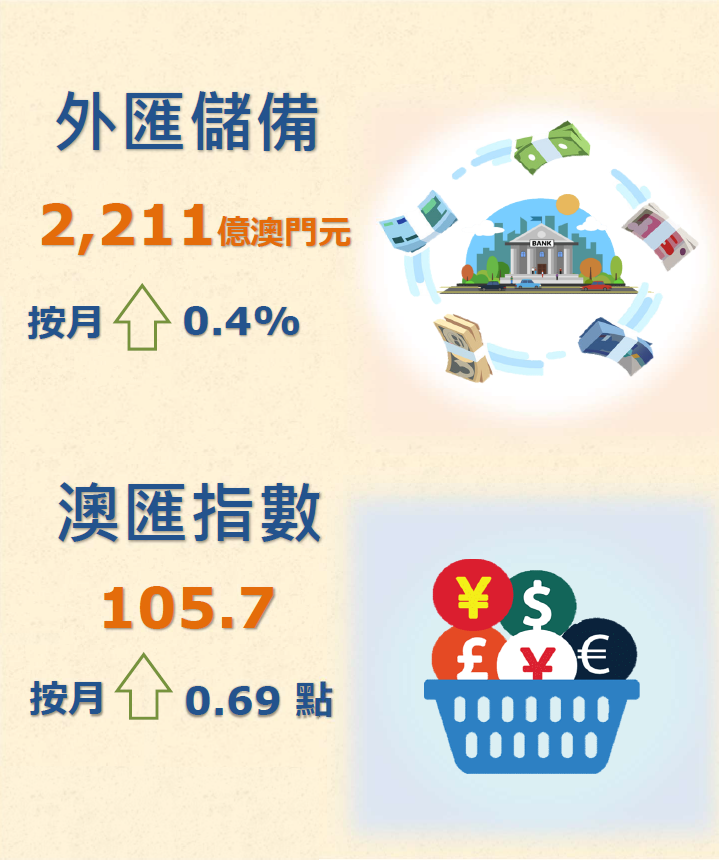 澳門金融管理局今(16)日公佈,2023年10月底澳門特別行政區的外匯儲備資產總額,初步統計為2,211億澳門元(274.5億美元),較2023年9月經修訂總額2,201億澳門元(272.9億美元),上升了0.4%。2023年10月底的外匯資產總額,約相當於2023年9月底澳門流通貨幣的11倍或廣義貨幣供應(M2)中屬於澳門元部分的89.3%。