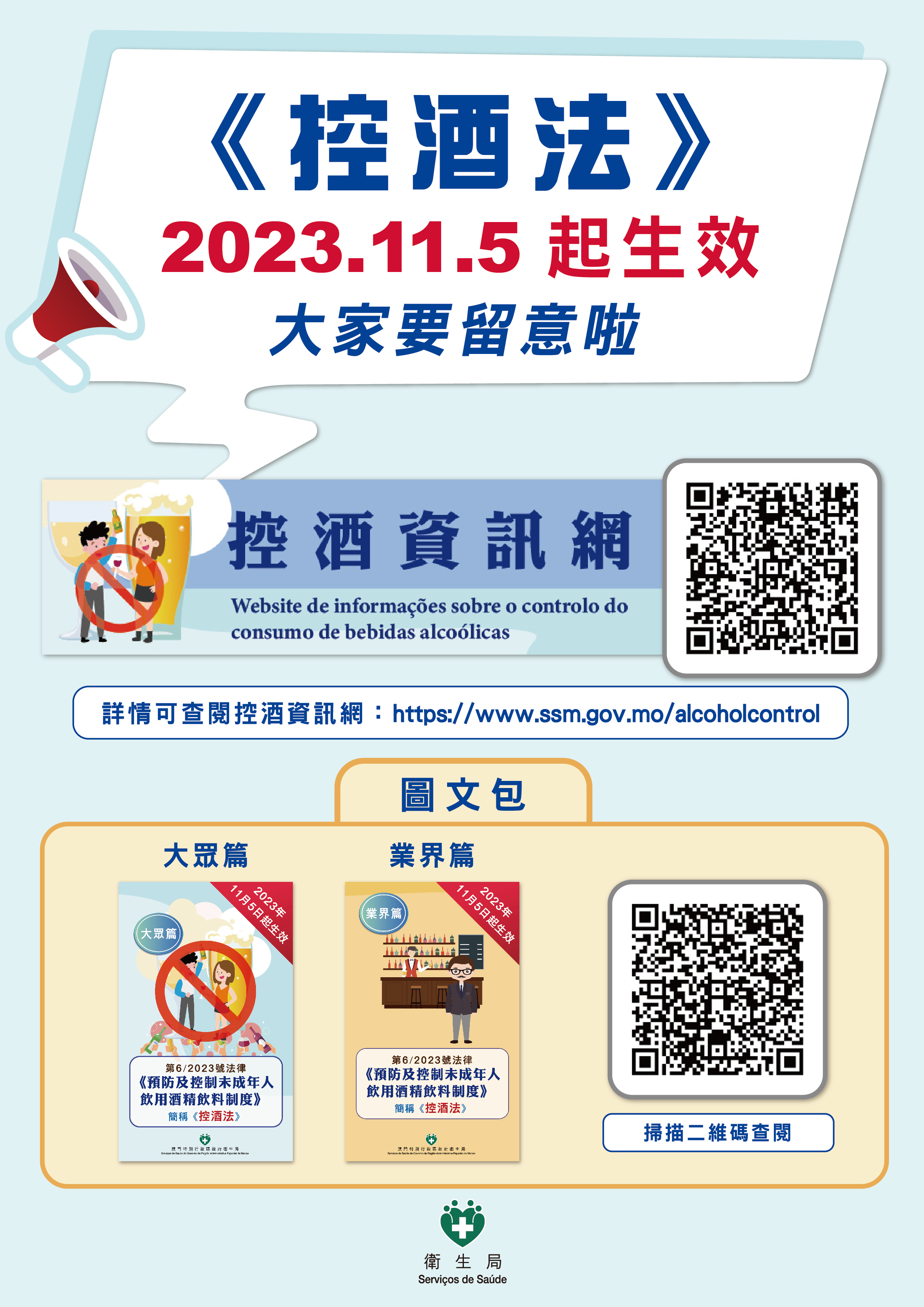 另外,根據《控酒法》規定,銷售或提供酒精飲料的地方,須以顯眼方式張貼經行政長官批示核准禁止向未成年人銷售或提供酒精飲料的標誌。《控酒法》同時規定,屬提供自助服務的商業場所須劃定及清晰標示陳列酒精飲料及非酒精飲料的區域,而酒精飲料的廣告應以中文、葡文及英文標明警語。如需索取相關標貼,可親臨防控煙酒辦公室、各衛生中心及政府綜合服務大樓領取或於網上下載。