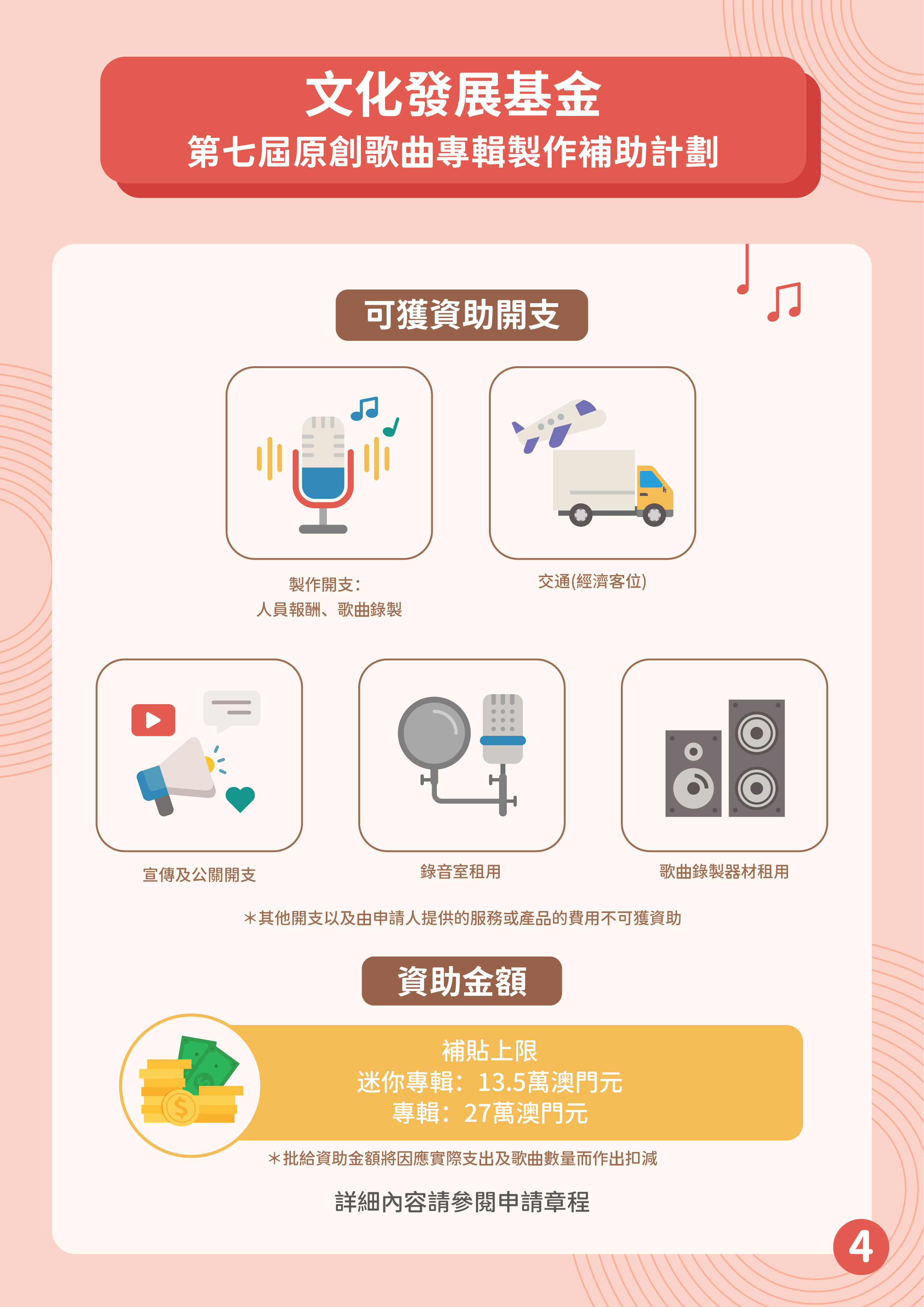 活動和項目評審委員會將根據申請項目的曲詞創作水平、編曲及製作水平、專輯演出者演唱水平、專輯製作計劃、團隊資歷、宣傳推廣計劃、預算合理性作出評分。“迷你專輯”資助名額最多6個,每個補貼上限13.5萬澳門元;“專輯”最多4個名額,每個補貼上限27萬澳門元。可獲資助開支包括製作、交通、宣傳、錄音室及設備租賃等費用,資助期18個月。此外,基金並將安排專家為資助者提供專輯製作等相關專業意見。