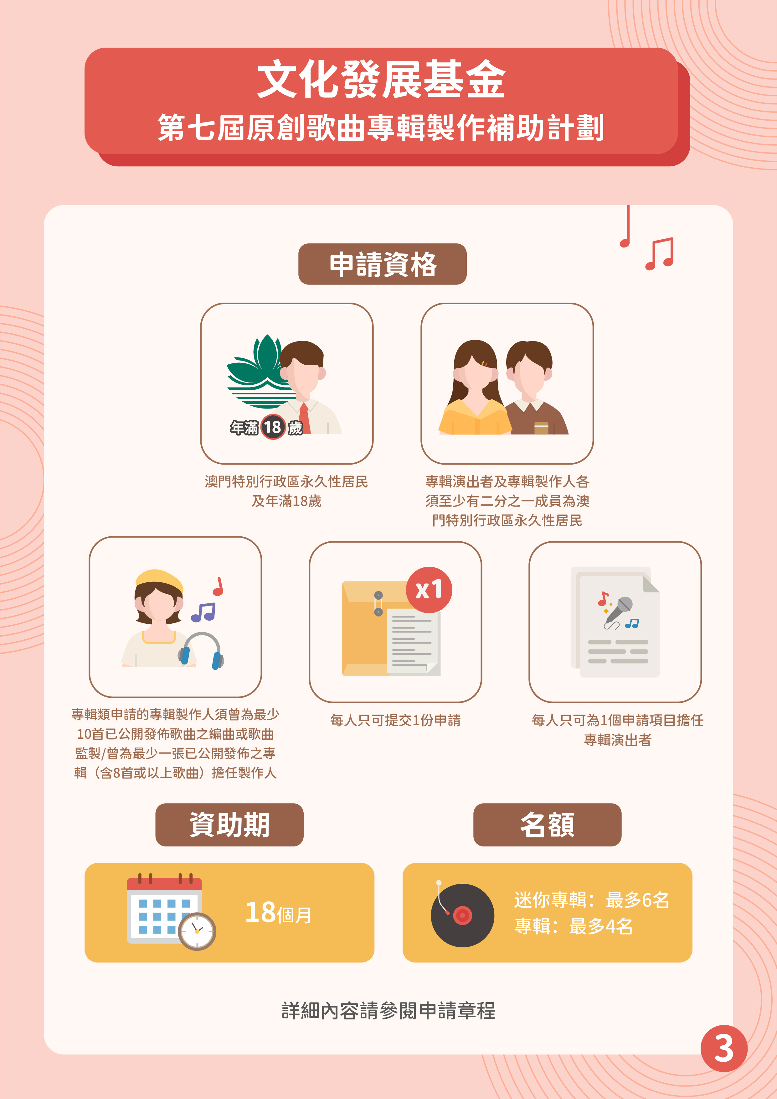 為詳細介紹“第七屆原創歌曲專輯製作補助計劃”的申請事宜及解答申請人問題,基金將於11月21日下午3時假誠豐商業中心7樓演講廳(地址:澳門宋玉生廣場322-362號)舉行專場講解會,有興趣人士請於基金網站(www.fdc.gov.mo)報名,查詢請致電8985 0862或電郵karenchoi@fdc.gov.mo。