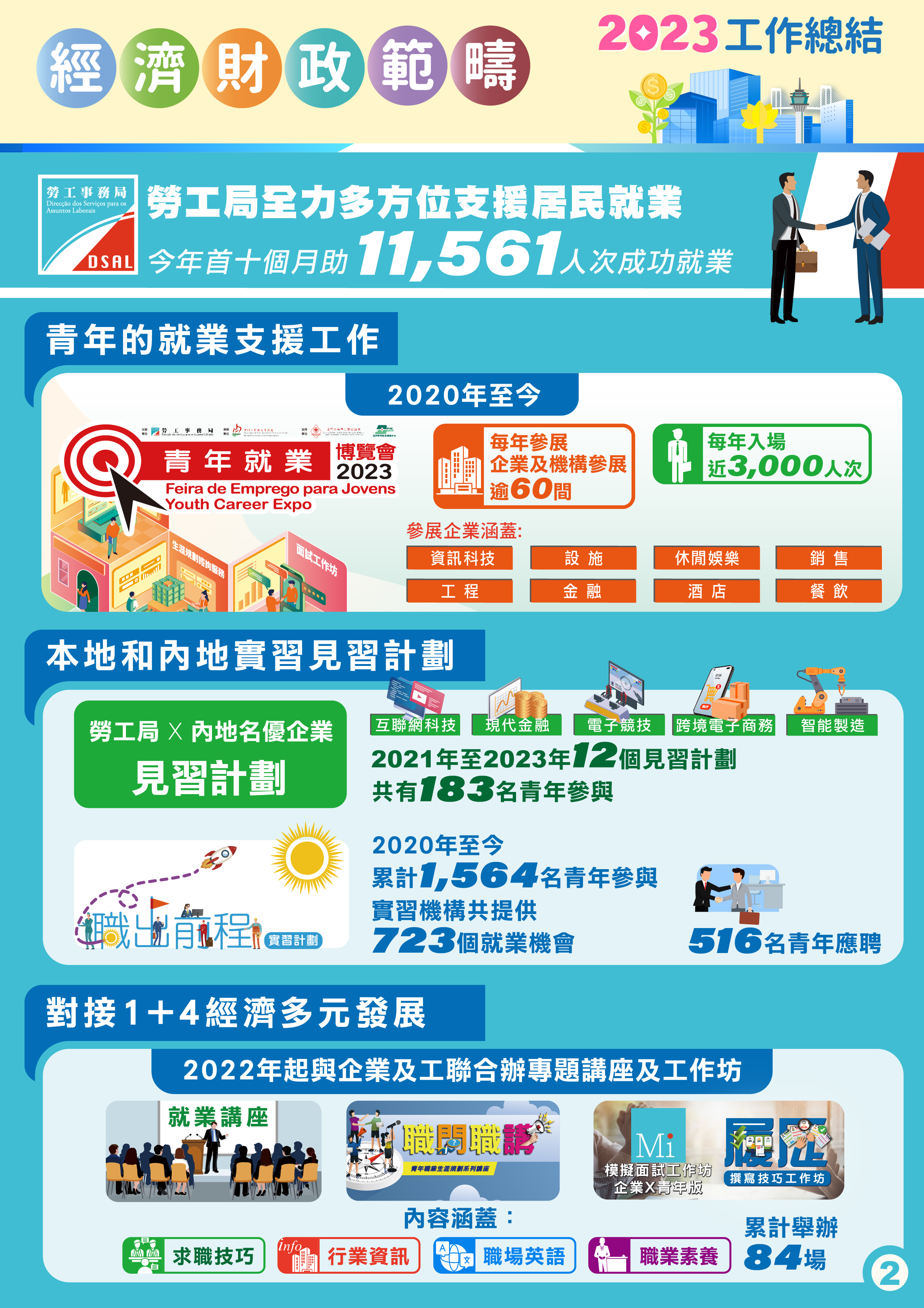 勞工局積極推動居民就業,2023年1月至10月累計協助11,561人次獲聘,涉及建築業有808人,為去年2022年全年透過勞工局成功就業人數(6288人次)的1.8倍,約相當於2023年7月至9月就業調查中本地居民勞動人口的4%。