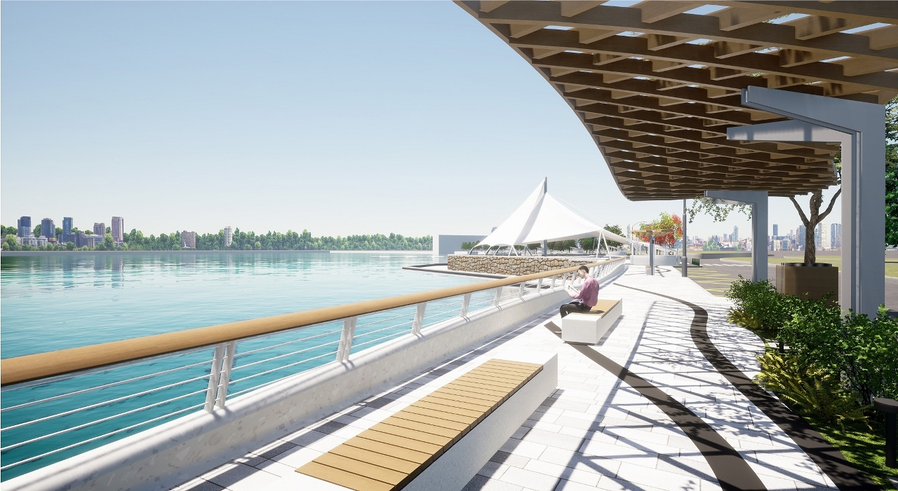 第二期工程面積約7,400平方米,由雅文湖畔入口至立法會路段,除更換行人路飾面及於樓梯出入口增設玻璃雨篷外,將沿湖增遮陽花架及花槽,增加高低層次的綠化。另外,對於現時行人路圍基高度不足,存在安全隱患的情況,將拆掉沿湖舊圍基,改設波浪型金屬圍欄配枕木托手,沿湖邊設置適量座椅,為行人提供遮陽和休閒的步行環境,亦達到人車分隔的效果。