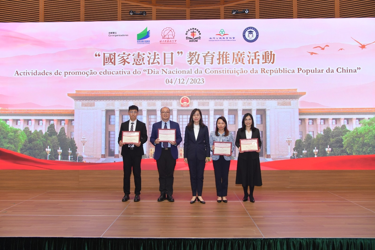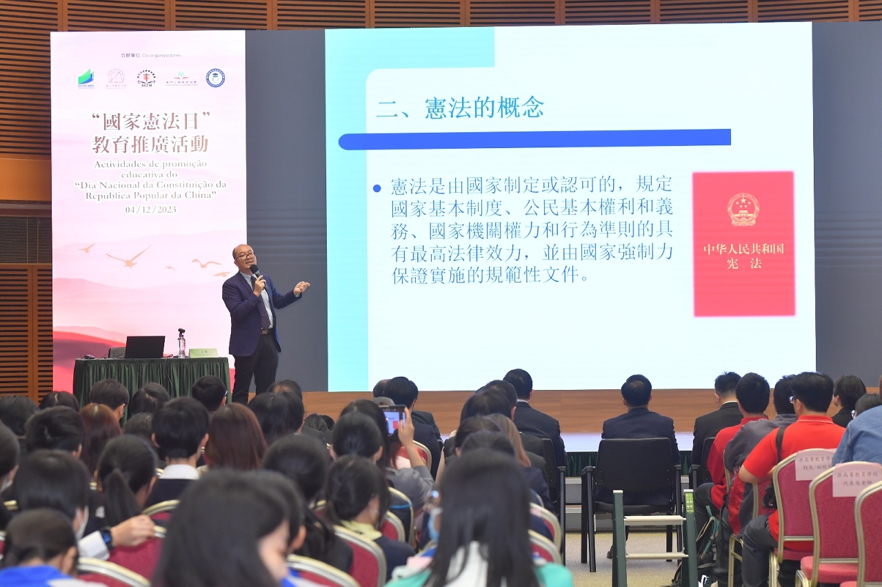 為加深青年學生對《憲法》和《基本法》的認識,教育及青年發展局聯同澳門中華教育會、澳門天主教學校聯會、澳門公職教育協會及澳門高等教育發展促進會於12月4日在澳門科學館會議廳舉辦國家憲法日教育推廣活動。社會文化司司長歐陽瑜、中央人民政府駐澳門特別行政區聯絡辦公室教育與青年工作部部長李雪飛、教育及青年發展局局長龔志明、澳門基金會行政委員會委員區榮智、教青局副局長丁少雄、阮佩賢及黃嘉祺、澳門中華教育會會長陳虹、理事長鄭洪光、澳門高等教育發展促進會會長莫啓明、澳門天主教學校聯會會長周伯輝、澳門公職教育協會會員大會主席劉文堯、教育委員會委員、青年事務委員會委員、澳門高等院校及非高等教育學校校長及代表,以及教青局主管等出席。