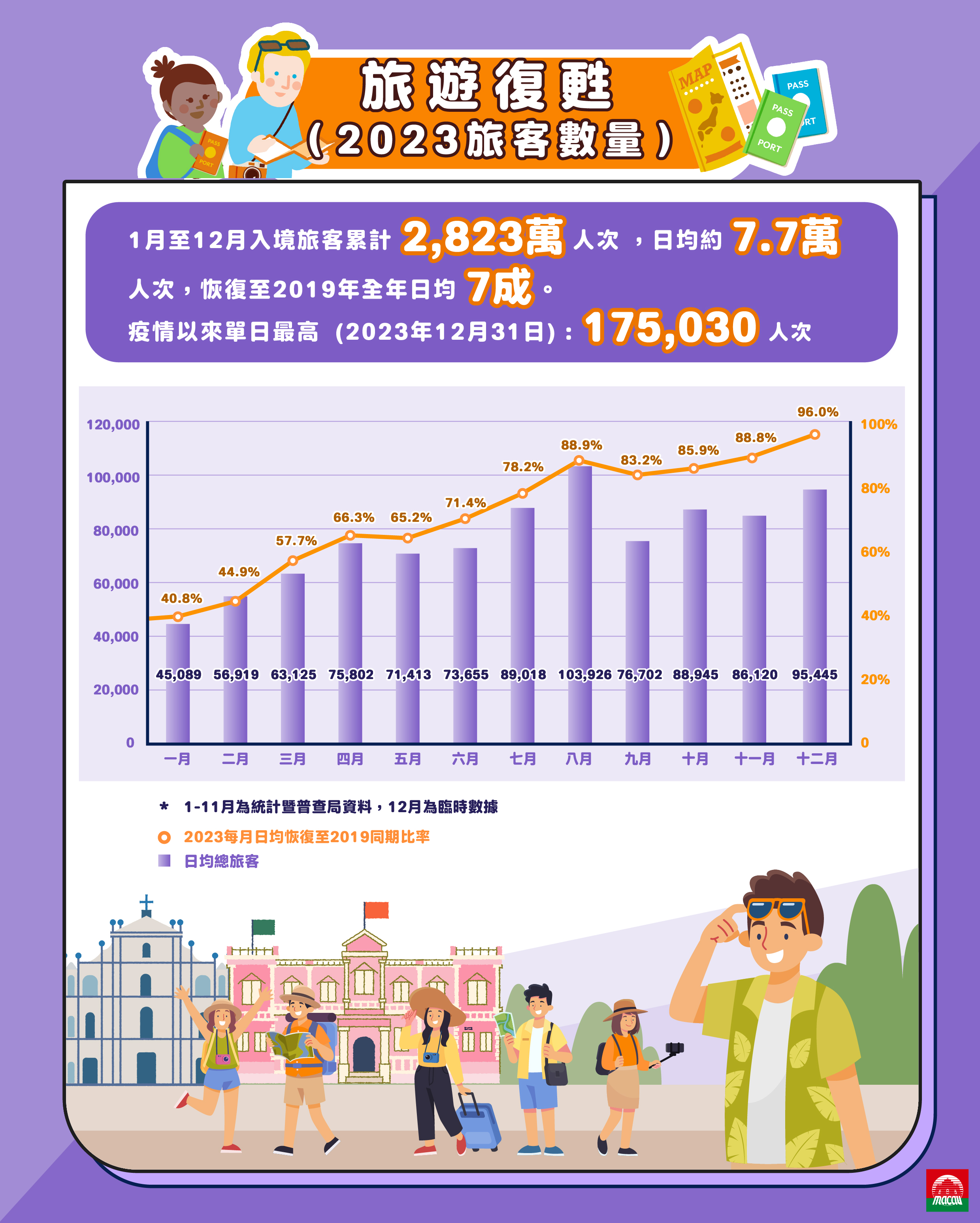 國際客源方面,復甦情況同樣顯著,2023年12月26日至30日連續5天均錄得超過1萬人次水平,當中12月30日更錄得12月最高國際旅客11,258人次入境,對比2019年12月最高國際旅客12,104人次,恢復率約為93%。根據臨時數據,每月日均國際旅客與2019年同期相比的恢復比率,從2023年1月的10.1%,大幅升至2023年12月的94.4%。