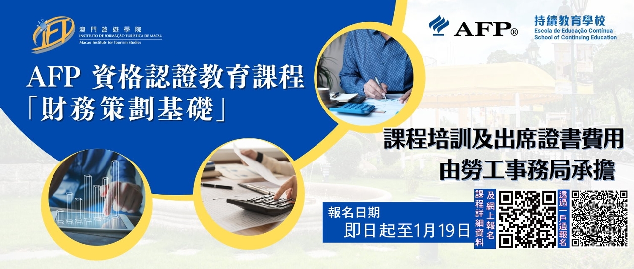 澳門旅遊學院的持續教育學校在2023年成為助理財務策劃師(AFP)資格認證教育課程的認可院校,開設國際認可的財務策劃課程,學員完成課程後可參加認可財務策劃師CFP資格認證(基礎階段)考試。新一期課程由即日起至1月19日接受報名,歡迎有志投身金融行業的居民報讀。