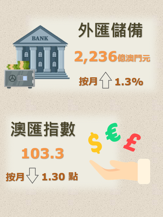 澳門金融管理局今(15)日公佈,2023年12月底澳門特別行政區的外匯儲備資產總額,初步統計為2,236億澳門元(277.7億美元),較2023年11月經修訂總額2,206億澳門元(274.4億美元),上升了1.3%。2023年12月底的外匯資產總額,約相當於2023年11月底澳門流通貨幣的11倍或廣義貨幣供應(M2)中屬於澳門元部分的91.0%。