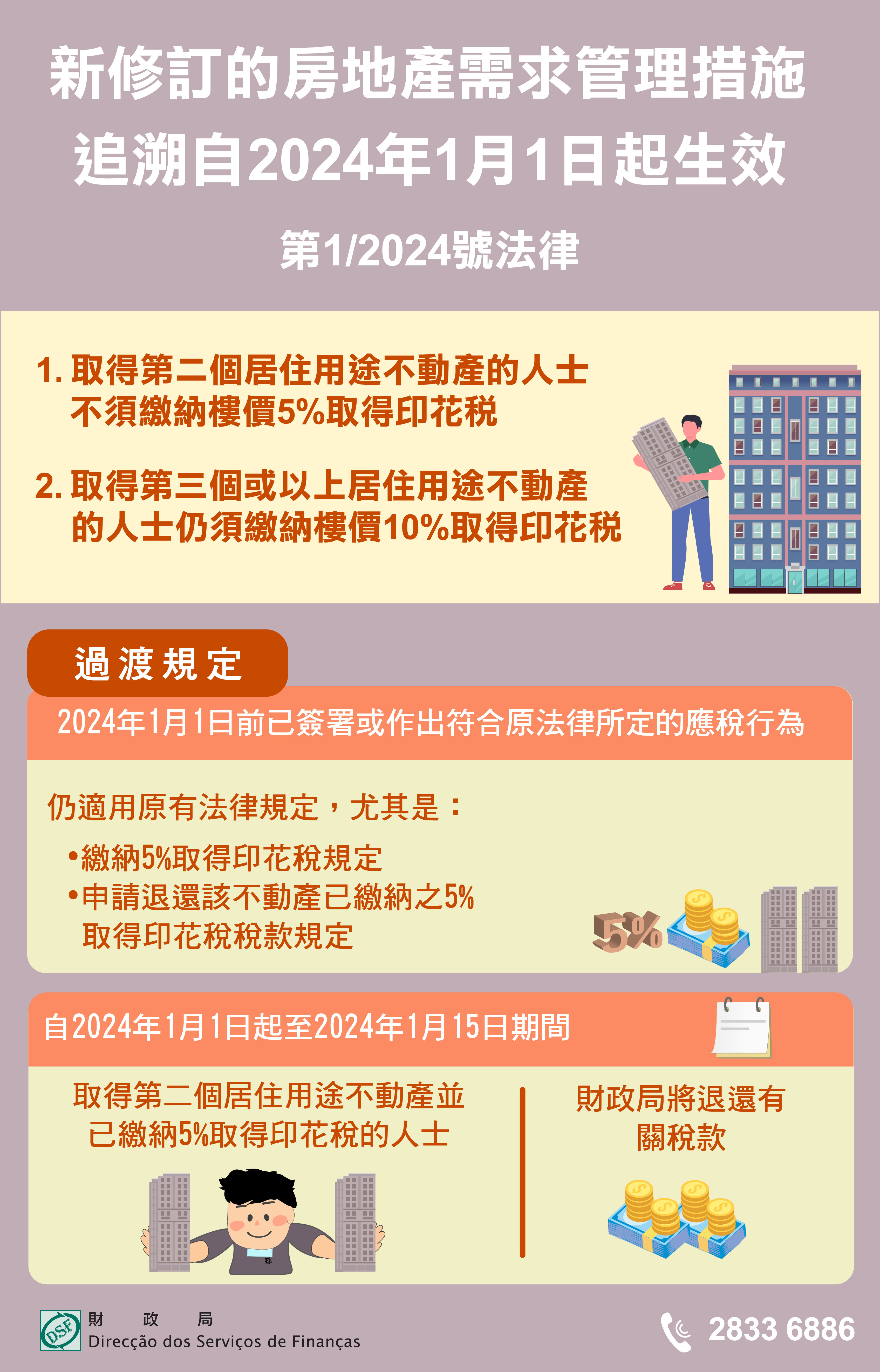 至於自2024年1月1日起至2024年1月15日期間取得第二個居住用途不動產並已繳納百分之五取得印花稅的人士,財政局將主動向該等人士退還有關稅款。