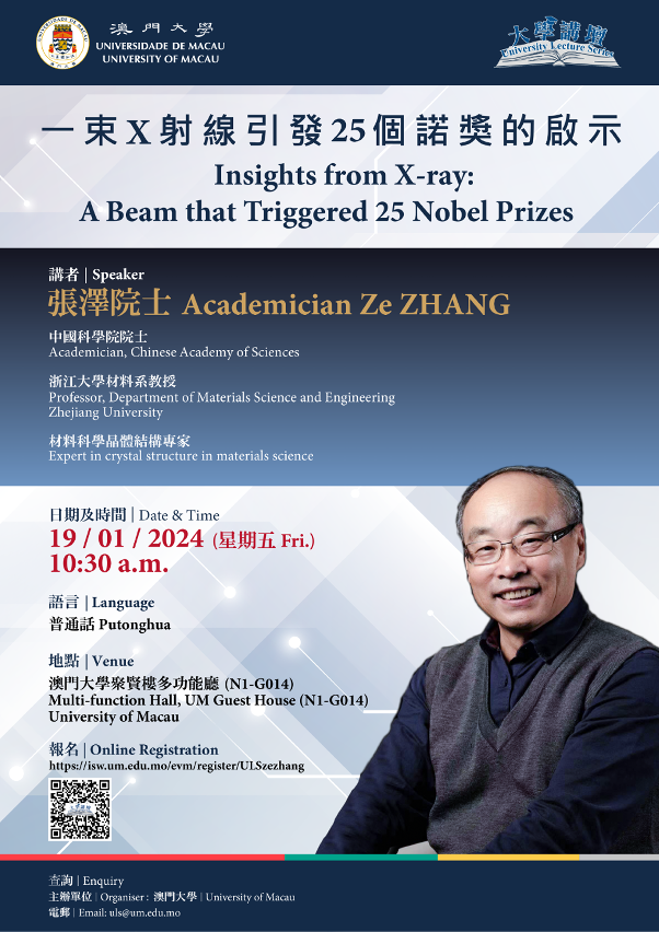 澳門大學將於1月19日(星期五)舉辦“大學講壇”,邀請中國科學院院士、浙江大學材料系教授張澤以“一束X射線引發25個諾獎的啟示”為題發表演說,探討X射線從1895年至今對人類文明進步的影響,歡迎有興趣人士參加。