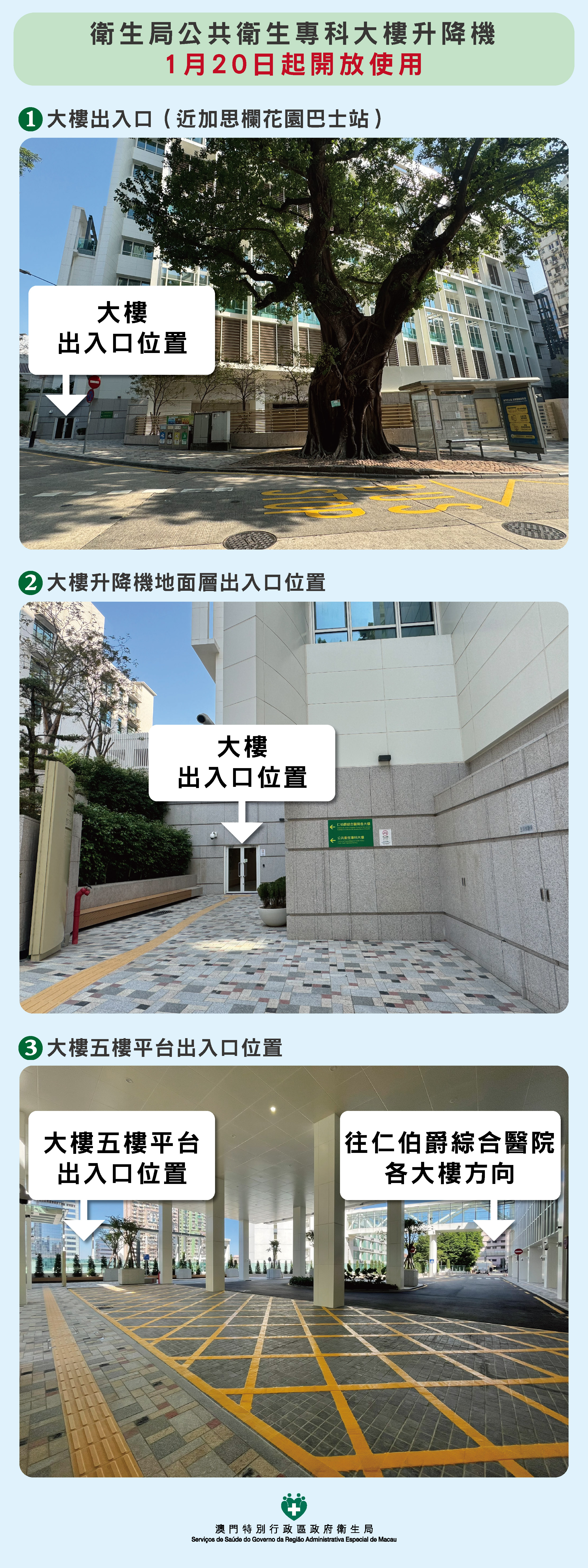 衛生局公共衛生專科大樓升降機將於1月20日起開放給公眾使用,以方便居民前往仁伯爵綜合醫院。居民可經位於加思欄花園對面的公共衛生專科大樓地面層出入口(加思欄花園巴士站旁),乘坐升降機來往若憲馬路至仁伯爵綜合醫院範圍,現場設有方向指示牌以作提示。