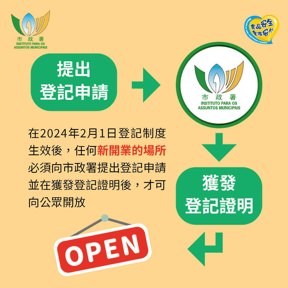 市政署提醒,在登記制度生效後零售鮮活食品場所必須在開業前向市政署提出登記申請,並在獲發登記證明後,方可向公眾開放。由文件齊備之日起市政署於三十個工作日內發出登記證明。商戶在領有登記證明後,須將登記證明張貼於場所顯眼處;如利用互聯網或社交平台進行宣傳,亦須將登記的資料上載於各網絡平台上。讓消費者在選購鮮活食品時掌握更清晰資訊,保障自身權益。