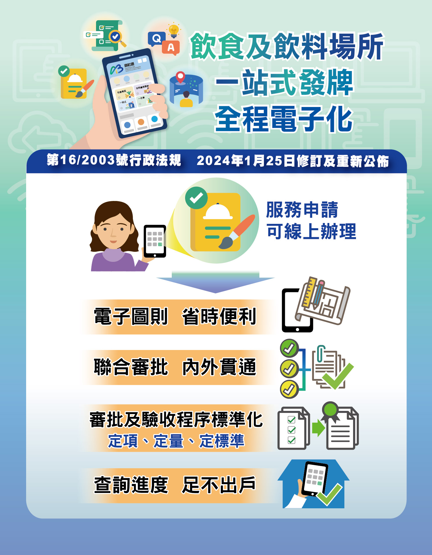 隨著特區政府電子政務的不斷發展,為進一步提升飲食及飲料場所一站式發牌制度的成效,回應業界反映“動工難、審批難、開業難”的訴求,創造更有利的營商環境,市政署對第16/2003號行政法規進行修訂。