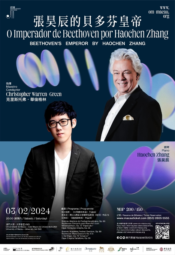 由文化局、澳門樂團有限公司及六大綜合度假休閒企業合辦的澳門樂團2023-2024樂季,將於2月3日(周六)晚上8時在澳門大學大學會堂(N2)舉行《張昊辰的貝多芬皇帝》音樂會。英國指揮大師克里斯托弗‧華倫格林將聯同澳門樂團呈獻多首經典樂章,而蜚聲國際的鋼琴家張昊辰,亦將演奏貝多芬的第五號鋼琴協奏曲《皇帝》,為觀眾帶來美妙難忘的聆聽體驗,門票現正於澳門售票網公開發售。