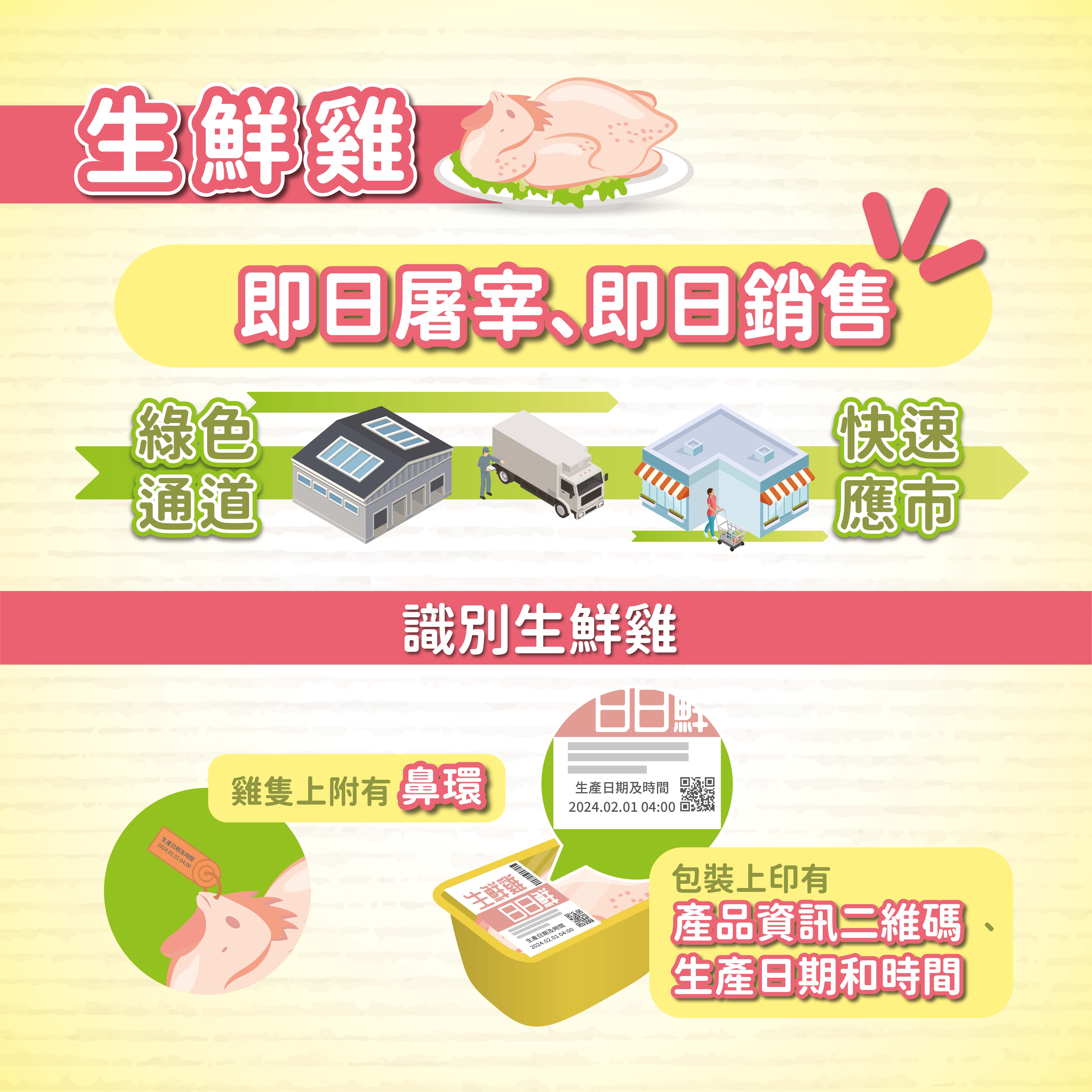 在國家海關總署的大力支持下,即日屠宰即日銷售的“生鮮雞”將在2月2日首發供澳。為讓“生鮮雞”出廠後於1.5小時內運抵本澳上市,粵澳雙方協調快速通關及優先檢驗檢疫流程。為方便消費者識別,供澳“生鮮雞”須佩有標示屠宰日期的鼻環,外包裝上亦須印有產品資訊、屠宰日期及時間等。市政署已制定《零售生鮮雞的衛生指引》,和業界舉行講解會,介紹“生鮮雞”的運輸、貯存、展示及售賣等各環節食品衛生要求。