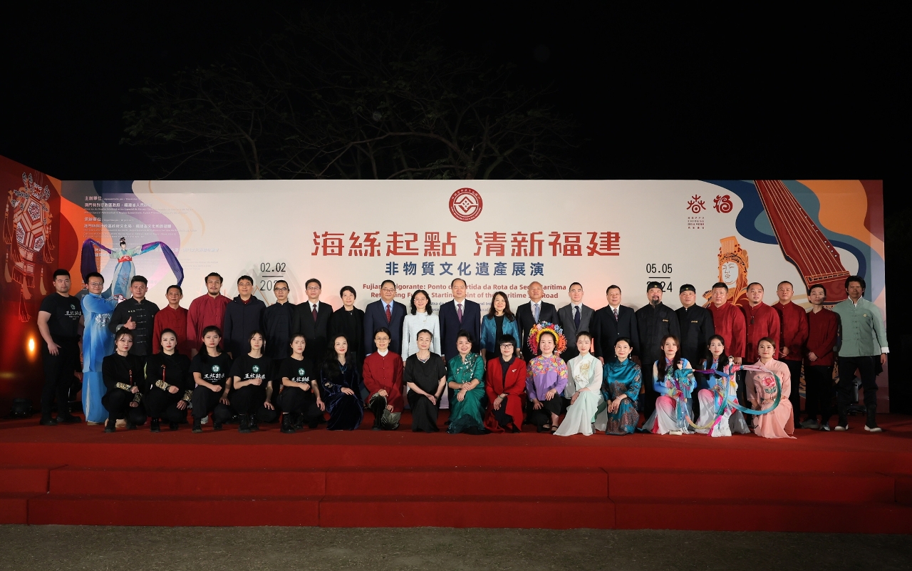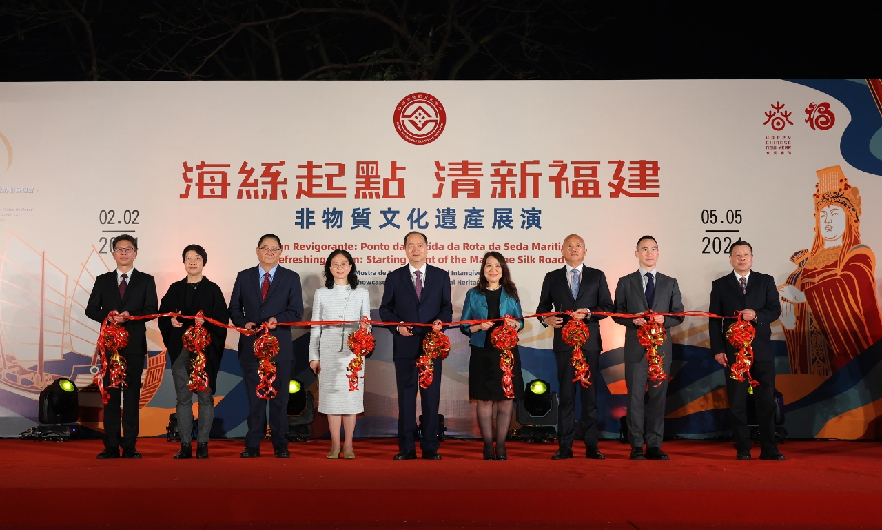 為深化閩澳文化交流合作,加深大眾對祖國非物質文化遺產的認識,由澳門特別行政區政府與福建省人民政府主辦的“海絲起點 清新福建──非物質文化遺產展演”於今日(2月2日)在大炮台花園舉行開幕式,中央人民政府駐澳門特別行政區聯絡辦公室主任鄭新聰,福建省人民政府副省長江爾雄,澳門特別行政區政府社會文化司司長代表、社會文化司司長辦公室主任何鈺珊,全國政協文化文史和學習委員會副主任、澳門基金會行政委員會主席、澳門文化界聯合總會會長吳志良,全國政協委員、澳門福建同鄉總會會長陳明金,澳門特別行政區政府文化局局長梁惠敏,全國政協委員、新濠博亞娛樂主席兼行政總裁何猷龍,福建省人民政府辦公廳副主任范慶洪,福建省文化和旅遊廳二級巡視員張立峰出席主禮,多位福建省及澳門文化範疇的嘉賓出席觀禮,開幕式期間上演具福建特色的偶戲及武術表演,現場氣氛熱烈。