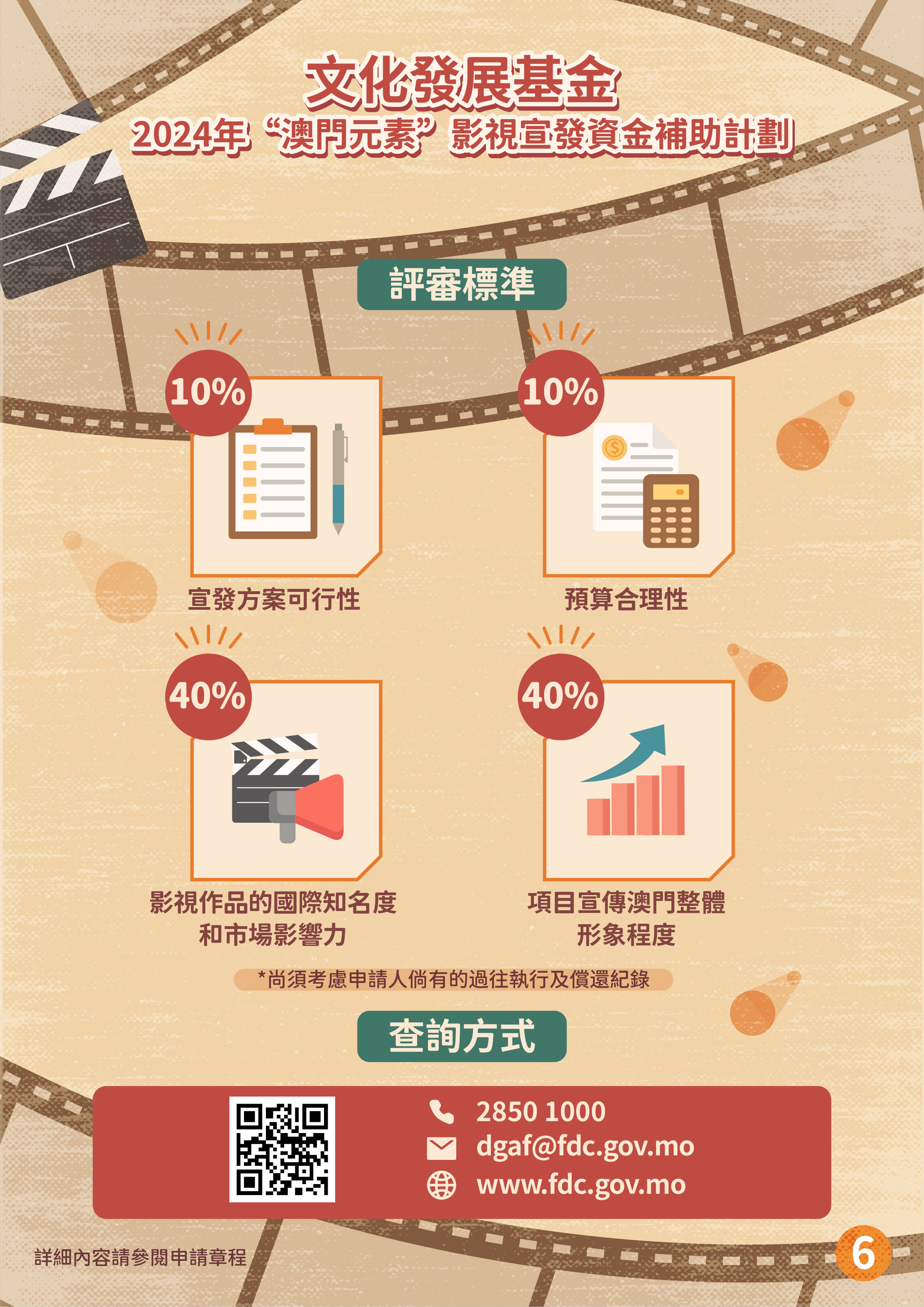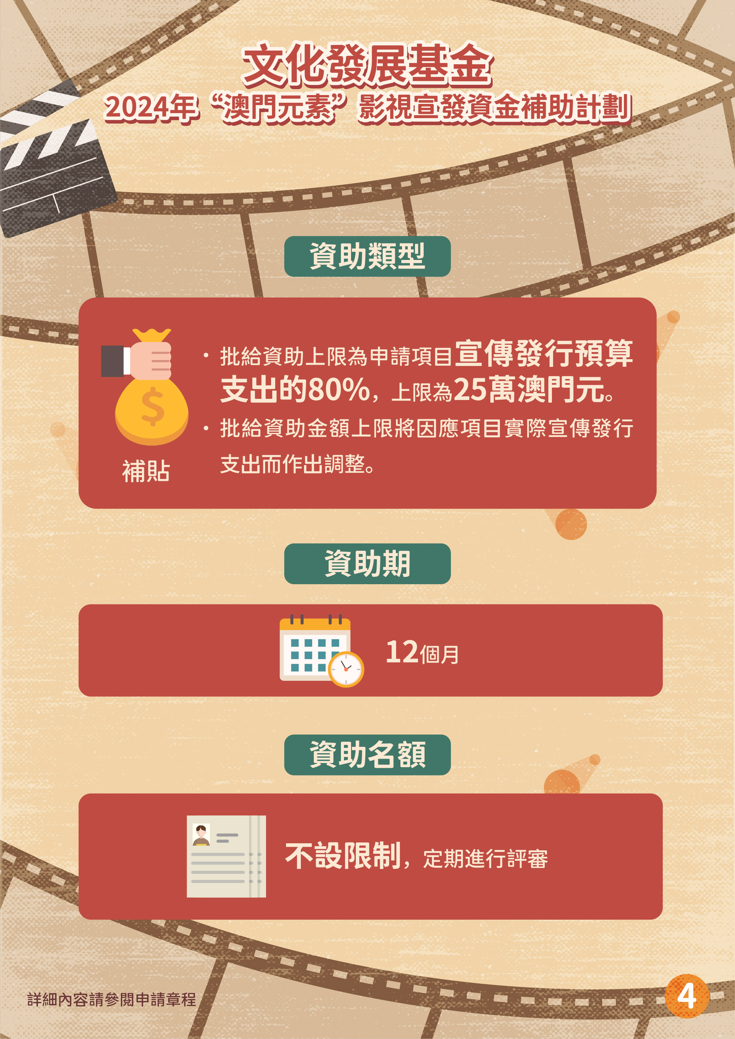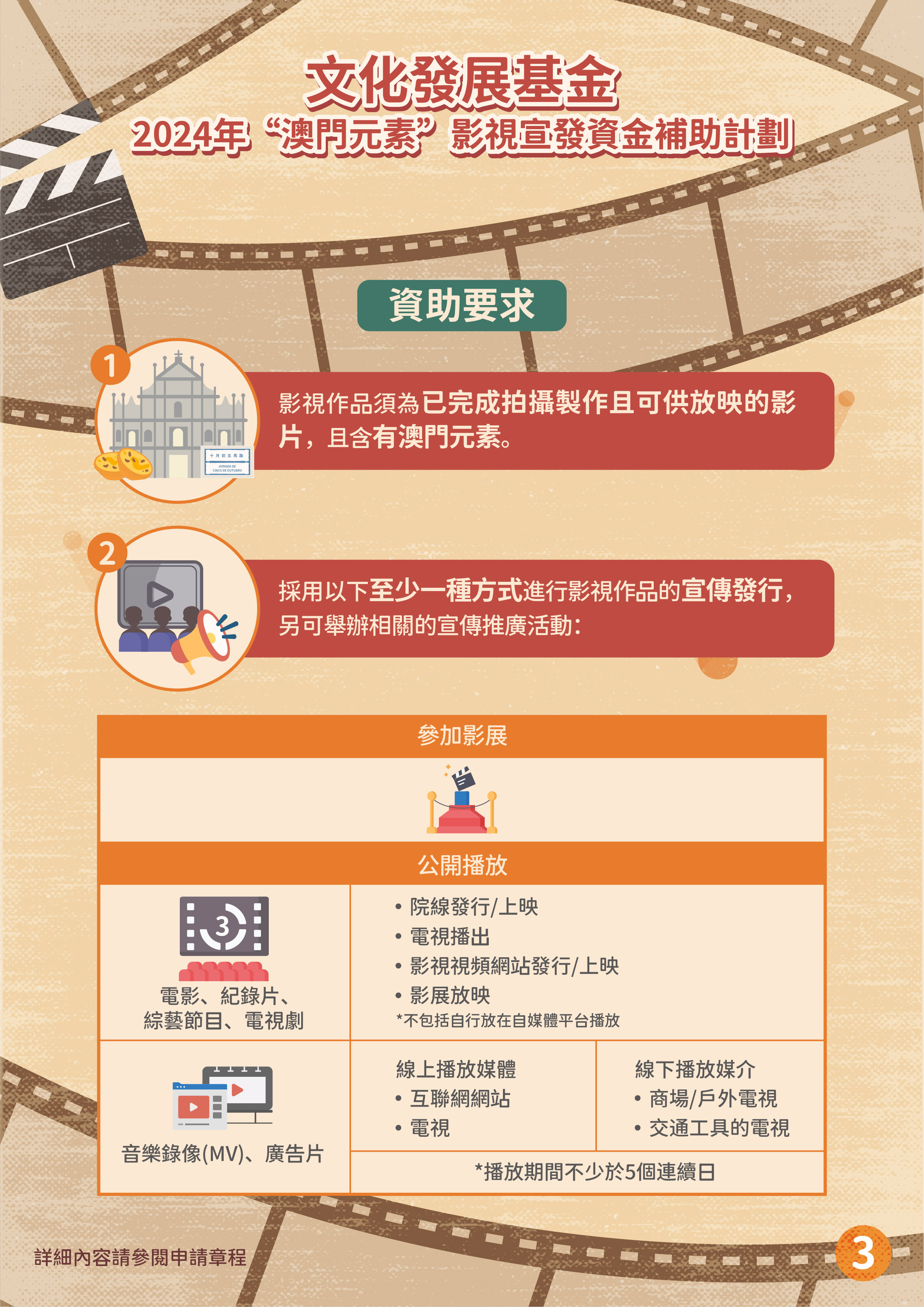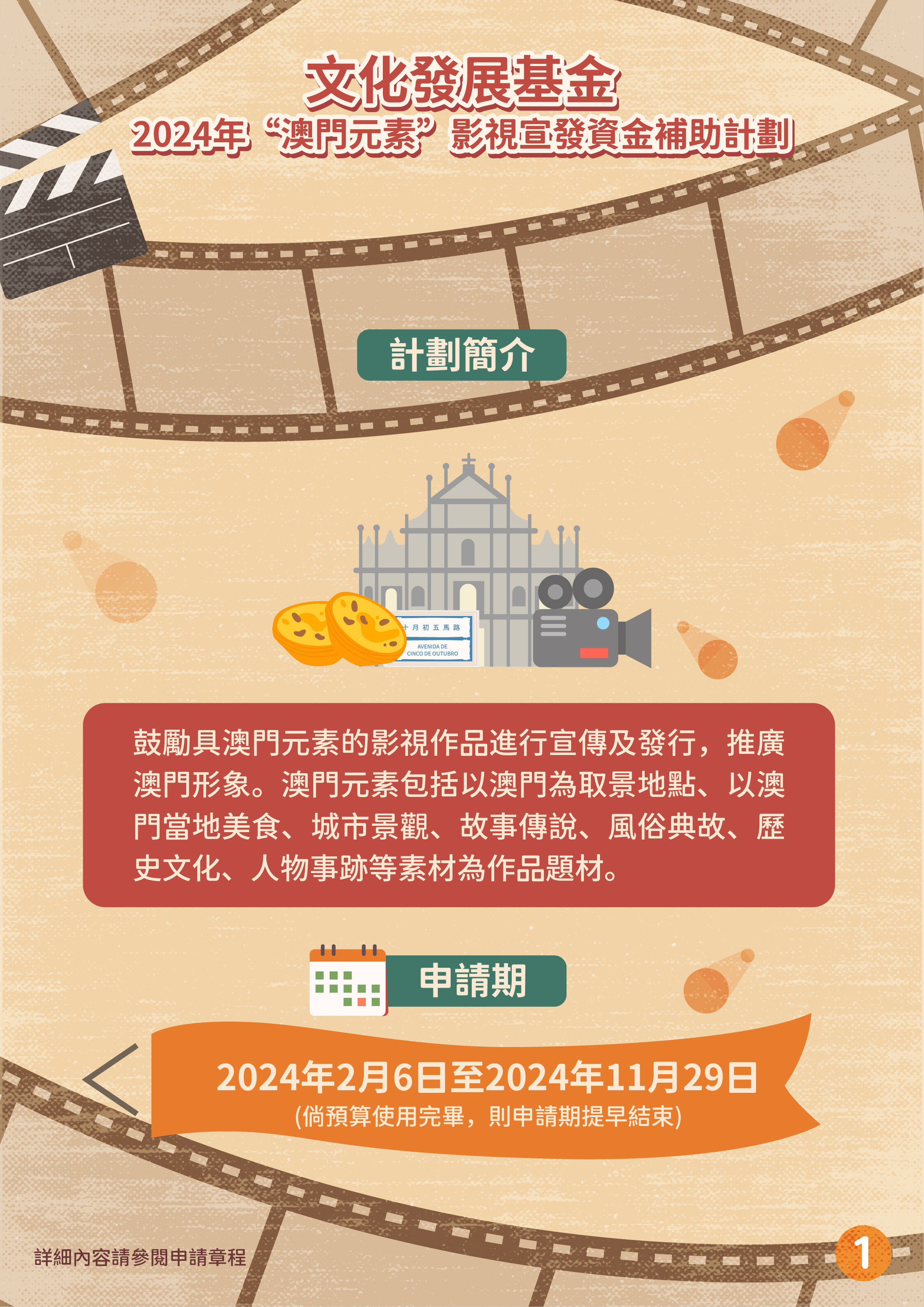文化發展基金推出“澳門元素”影視宣發資金補助計劃、“澳門取景”影視拍攝資金補助計劃,支持具澳門元素影視作品投入市場,加強宣傳澳門城市形象及提升國際知名度,帶動文創及旅遊的聯動性,推動澳門影視產業發展。
