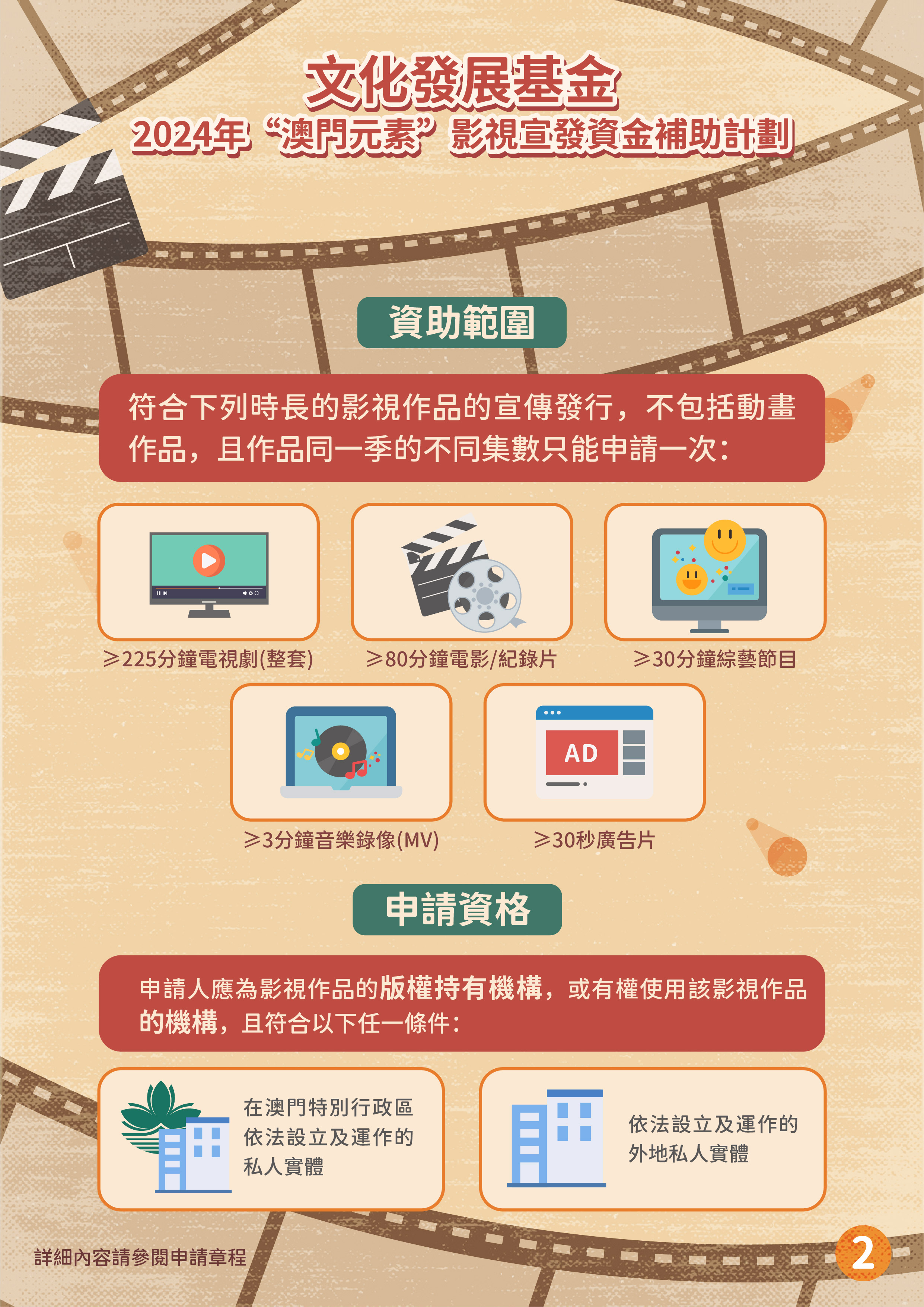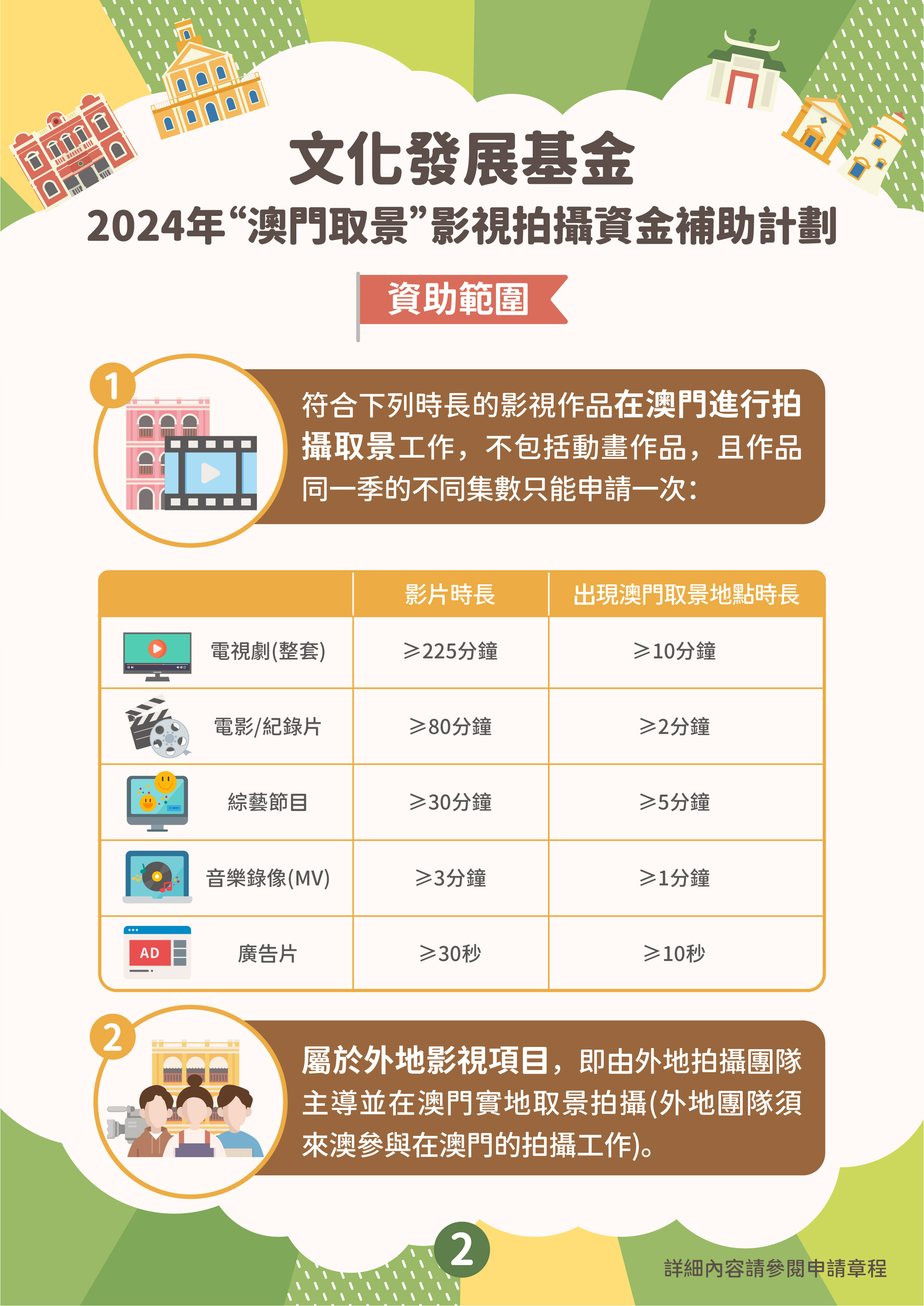 “澳門取景”影視拍攝資金補助計劃的目的是吸引外地拍攝團隊到澳門取景,通過影視作品宣傳推廣澳門形象,提升澳門的國際知名度,並為本地影視企業提供更多參與拍攝外地影視作品的機會。資助計劃接受在申請期開始前(即2024年2月6日前)、尚未開展在澳門取景拍攝工作且在澳拍攝的日數不少於3天的外地影視項目,由外地拍攝團隊主導並來澳參與拍攝工作。資助申請須由作為澳門製片單位的澳門商業企業主提出,其所營事業須與影視製作相關。獲資助的影視項目須在資助期內完成公開播放,公映版本的片長及片中出現澳門取景點的時長,須符合章程規定的時限要求。批給資助上限為申請項目在澳門進行拍攝取景工作預算支出的40%,上限為200萬澳門元。