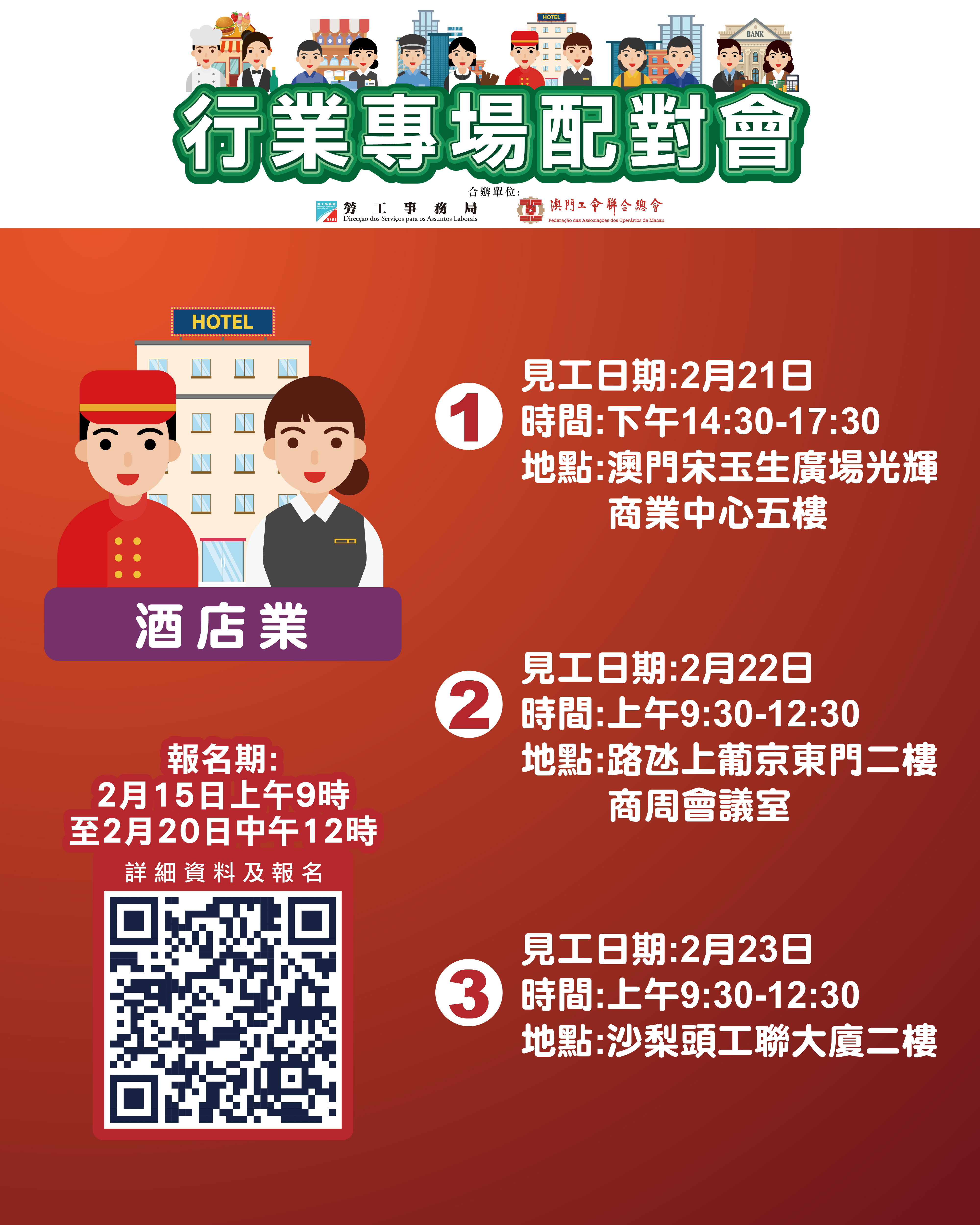 2月23日上午舉辦酒店業配對會,提供46個職位空缺,涉及飲食服務助理經理、康體部主任、管家部主任、倉庫管理員、客戶聯絡中心專員、健身教練、前台接待員、兒童天地服務員、廚師及餐飲服務員等。配對會在澳門工會聯合總會二樓(沙梨頭海邊街2-6號工聯大廈)舉行。