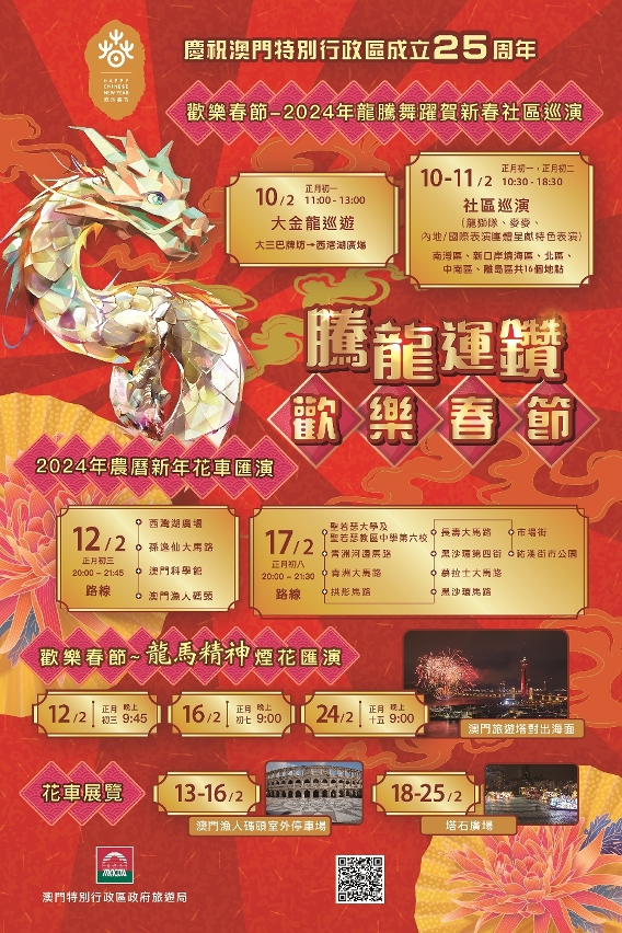 賀歲重頭活動“慶祝澳門特別行政區成立25周年 2024年農曆新年花車匯演 騰龍運鑽歡樂春節”將於明天農曆年初三(12日)及年初八(17日)分別在中區及北區舉行。明初三晚8時將在西灣湖廣場隆重開幕,呈獻精彩的暖場表演、開幕演出、花車巡遊和文藝表演等,加上壓軸綻放的首場“歡樂春節─龍馬精神煙花匯演”,共慶新春及澳門特別行政區成立25周年。