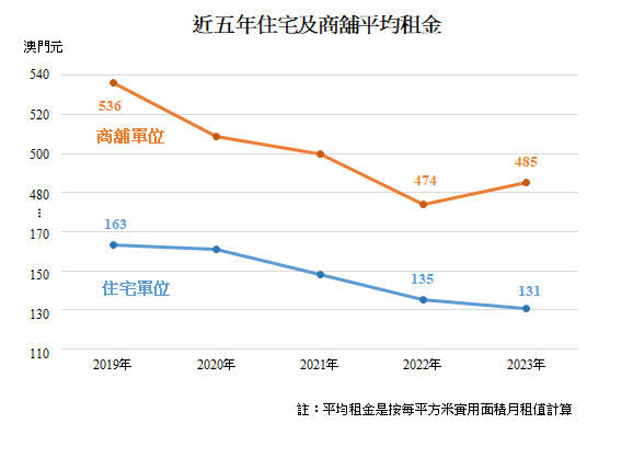 統計暨普查局資料顯示,2023年全澳住宅單位每平方米實用面積平均租金為131元(澳門元,下同),按年下跌3.0%,與2019年比較跌幅為19.6%,顯示疫情對住宅租金有較大的影響。在較多申報租約的分區中,黑沙環及祐漢區(123元)、新口岸區(111元)、氹仔中心區(131元)的平均租金按年分別下跌5.4%、4.3%及3.7%,黑沙環新填海區(154元)則上升1.3%。