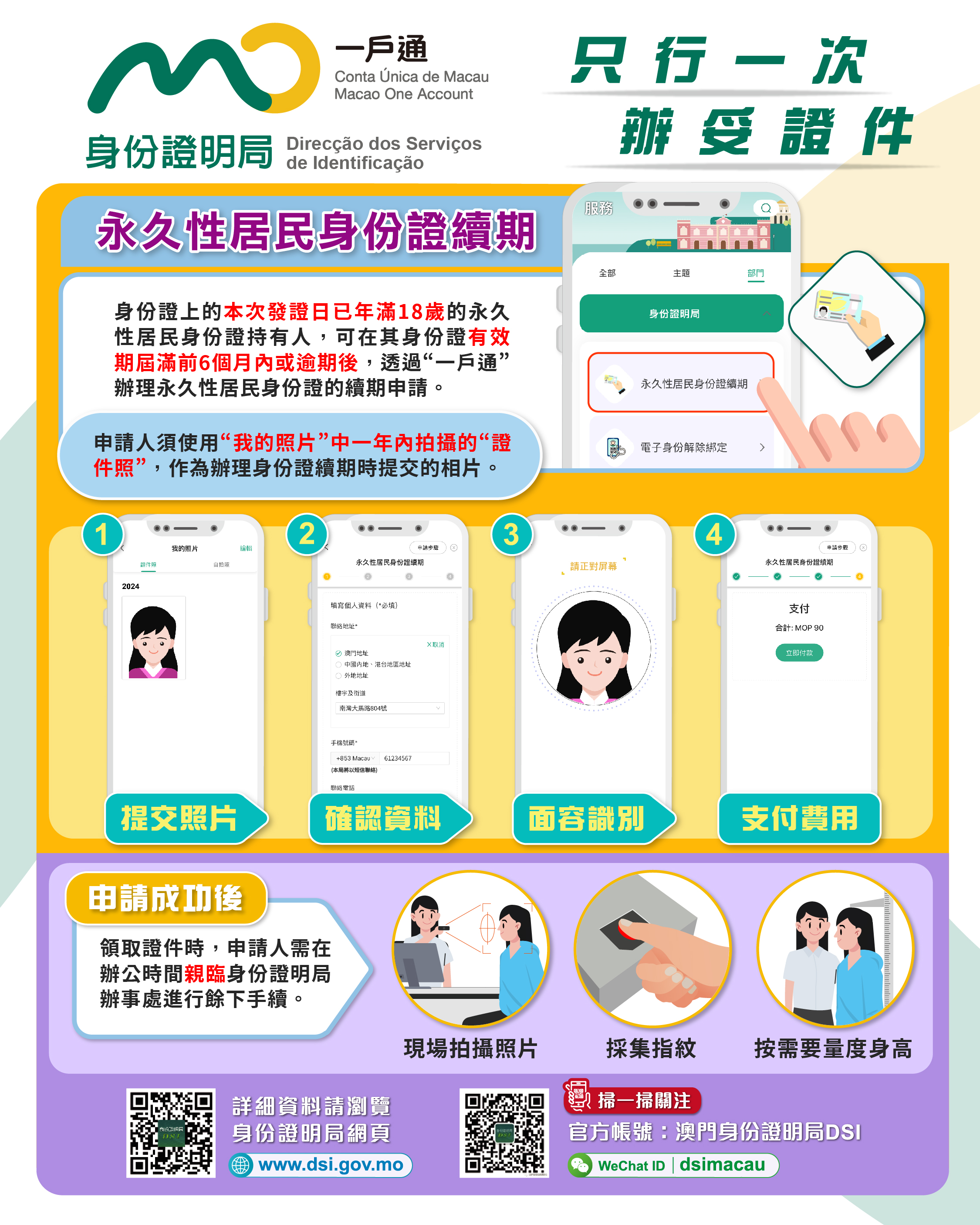 市民登入“一戶通”後,便可在“永久性居民身份證續期”服務辦理續期申請,申請時須使用“一戶通”內“我的照片”中一年內拍攝的“證件照”,作為辦理身份證續期時提交的相片,並在透過面容識別核實身份後,直接於線上支付便可完成申請手續。完成證件製作後,申請人於辦公時間親臨身份證明局領取證件時,只需辦理餘下手續即可,包括現場拍攝照片、採集指模、量度身高(只針對身份證上本次發證日未滿25歲的申請人)。