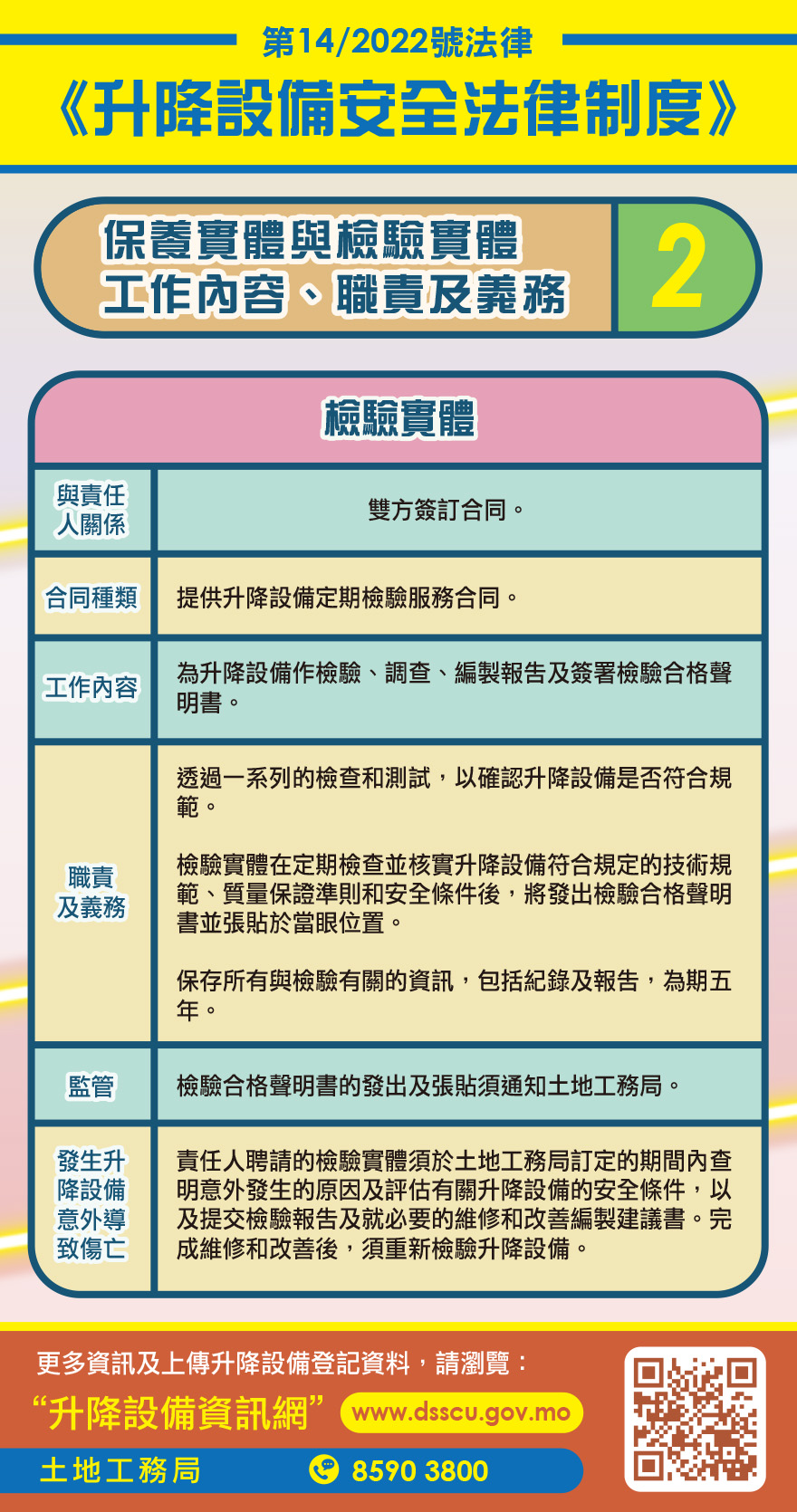檢驗實體負責為升降設備作檢驗、調查、編製報告及簽署檢驗合格聲明書。根據規定,升降設備在完成登記投入運作前須作檢驗,其後也須由檢驗實體作每年一次的定期檢驗,透過一系列的檢查和測試,以確認升降設備符合規範。在定期檢查並核實升降設備符合規定的技術規範、質量保證準則和安全條件後,檢驗實體須發出及簽署檢驗合格聲明書,張貼於升降機內部當眼處或電動扶梯入口當眼處,並通知土地工務局。