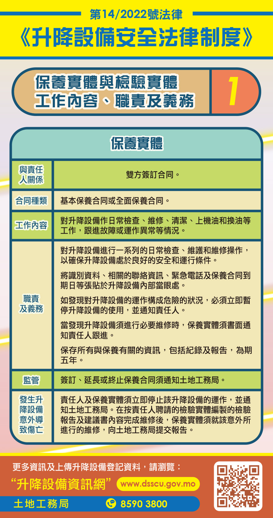 土地工務局已開通“升降設備資訊網” (https://www.dsscu.gov.mo/ascensores/zh/),除了相關法律資訊及宣傳材料外,亦設有升降設備電子化登記及升降設備技術員線上申請註冊功能,詳情請查閱該網站或致電工務局服務中心(8590 3800)。