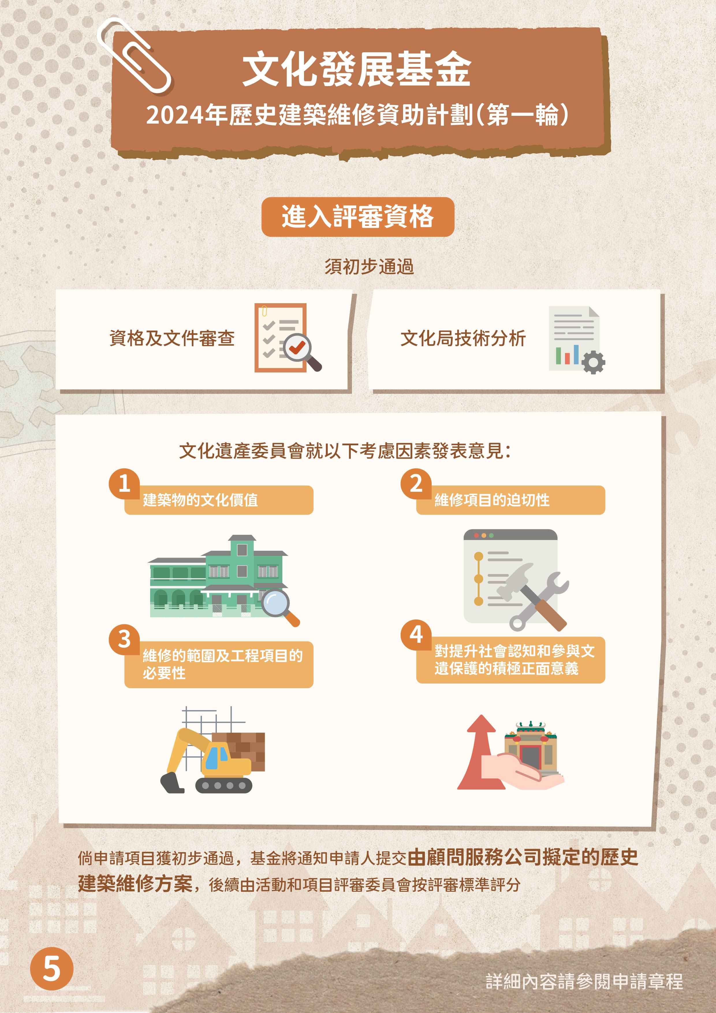 資助計劃支持業權人定期對私人文物建築和具文化價值建築開展結構檢查或檢測、實施外觀保養,以及因應檢測結果實施必要的修復及維護等工作。文化發展基金將對申請項目作資格及文件審查,並送交文化局進行技術分析,接着會交由文化遺產委員會就該申請建築物的文化價值、維修的迫切性和必要性,以及對提升社會認知和文遺保護的正面意義等因素發表意見。倘申請項目獲初步通過,基金將通知申請人提交由顧問服務公司擬定的歷史建築維修方案,後續由基金的活動和項目評審委員會就申請項目的維修工程必要性、建築物狀態的預期改善效果、預算合理性作出評分。