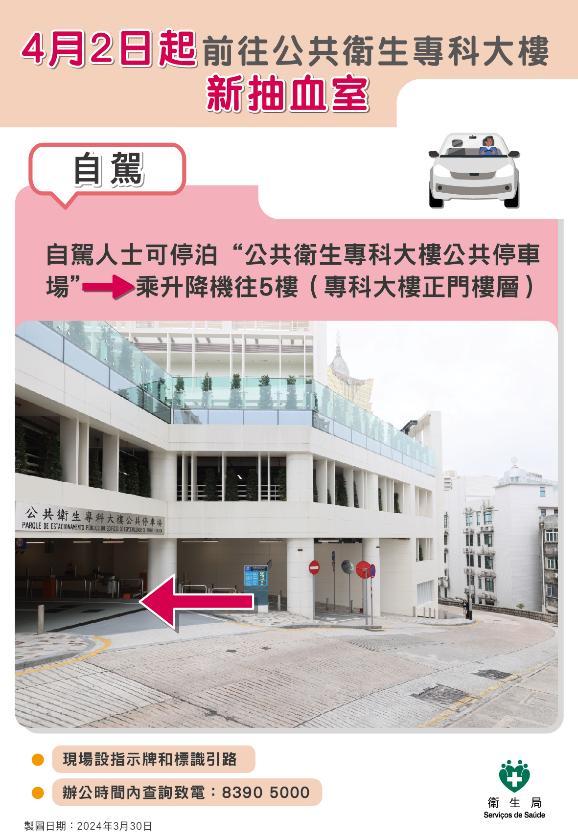 自駕人士可停泊加思欄後新馬路與若憲馬路之間的“公共衛生專科大樓公共停車場”,再乘升降機往5樓(專科大樓正門樓層)的新抽血室。