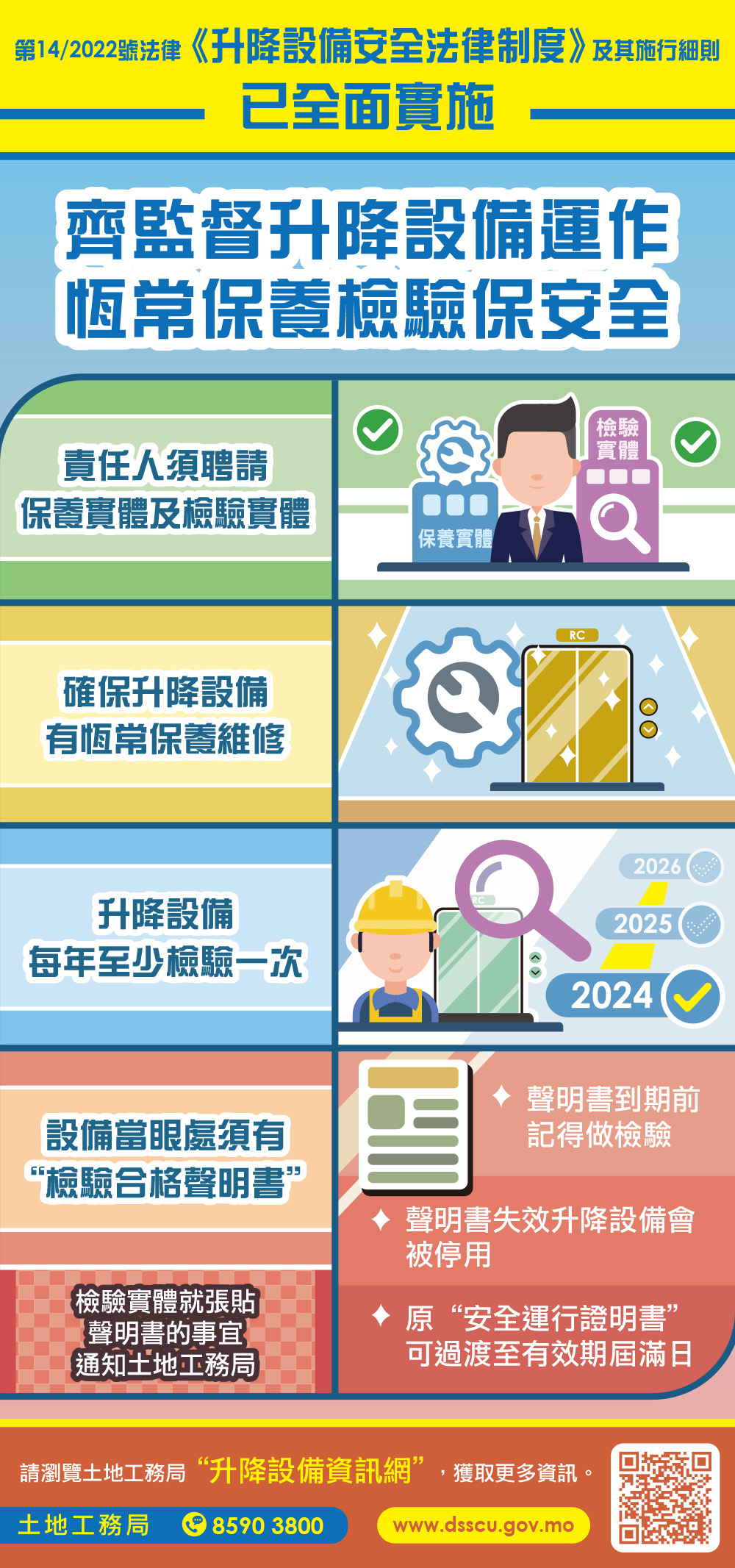 第14/2022號法律《升降設備安全法律制度》及相關配套法規於4月1日起正式生效實施,為確保設備使用安全,責任人須聘請保養實體和檢驗實體負責設備的保養及檢驗工作。升降設備每年須至少進行一次檢驗,並將檢驗合格聲明書張貼設備當眼處。土地工務局呼籲使用者注意升降設備使用情況,如有問題應透過升降機內的聯絡資訊通知保養實體。