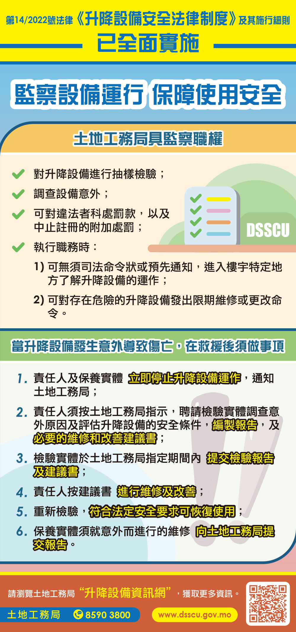 欲了解更多詳情,請瀏覽 “升降設備資訊網” https://www.dsscu.gov.mo/ascensores/zh/,或致電工務局服務中心(85903800)。