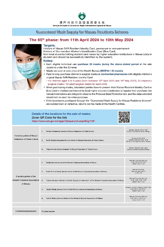 衛生局今(9)日公佈,第65輪保障口罩供應澳門居民計劃(下稱“口罩計劃”)於4月11日開始,具體如下: