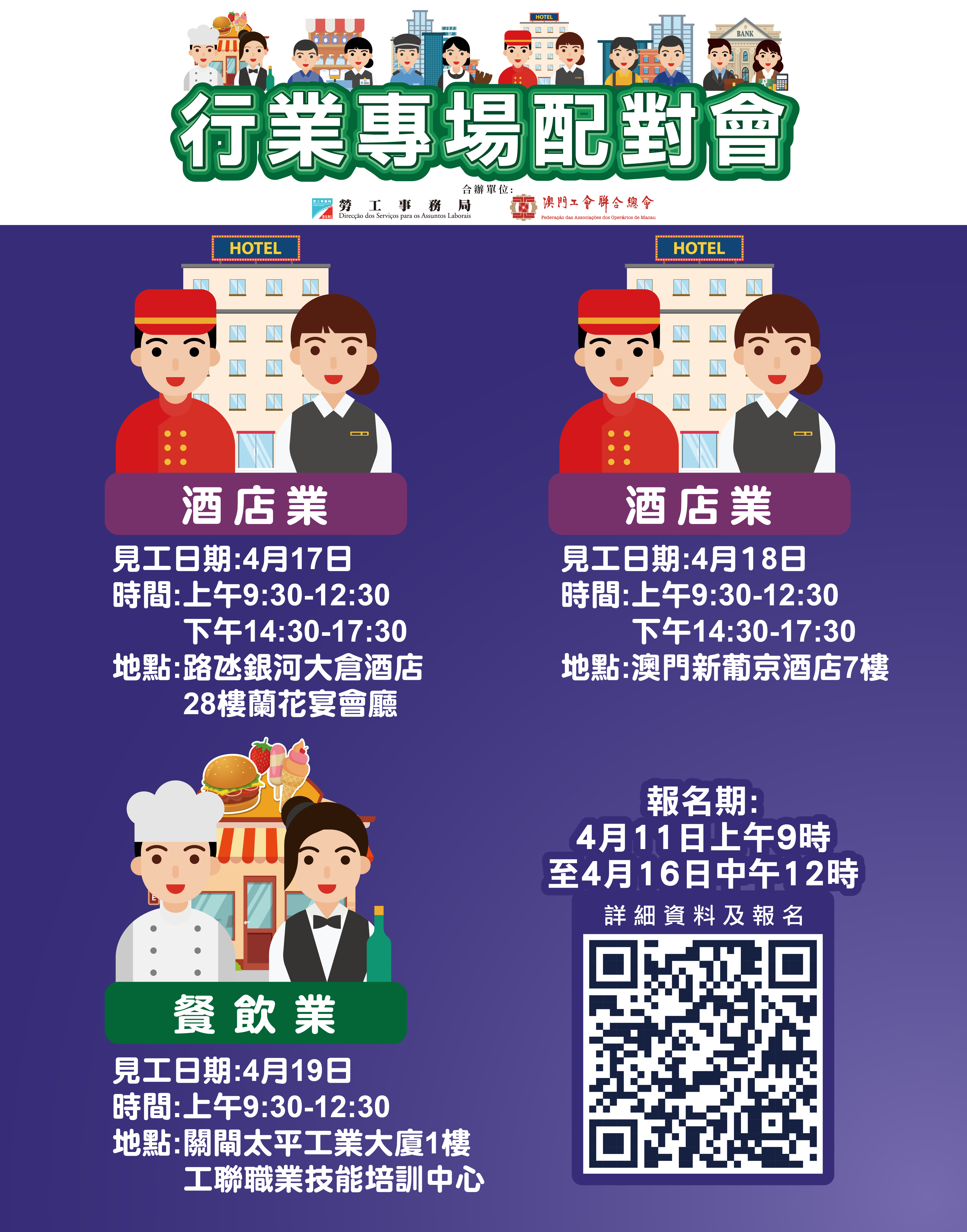 上述4月17日酒店業配對會在澳門大倉酒店28樓舉行;4月18日酒店業配對會在澳門新葡京酒店7樓舉行;4月19日上午餐飲業配對會在澳門工聯職業技能培訓中心(關閘馬路101-105A號太平工業大廈第一期1樓)舉行。報名日期為4月11日上午9時至4月16日中午12時。