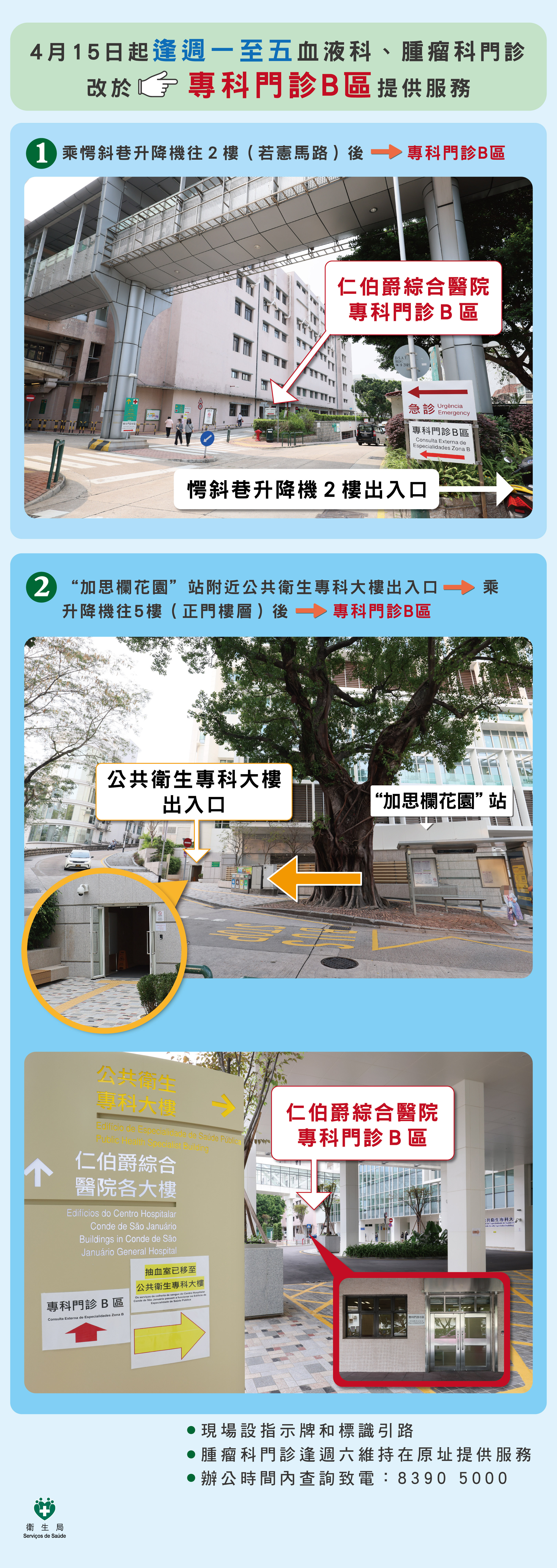 為持續優化血液科和腫瘤科門診服務,向患者提供更舒適且獨立的就診環境,並滿足日益增長的癌症治療服務需求,衛生局仁伯爵綜合醫院血液科和腫瘤科門診服務地點自4月15日(下週一)起作出如下調整: