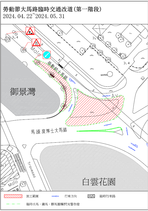為配合本工程交通管線施工及重舖路面,勞動節大馬路至馬揸度博士大馬路4月22日至5月31日期間分階段實施有限度通車(詳見附圖1及2 )。請駕駛者留意現場交通指示標誌或遵守現場交通警員的指揮及安排。