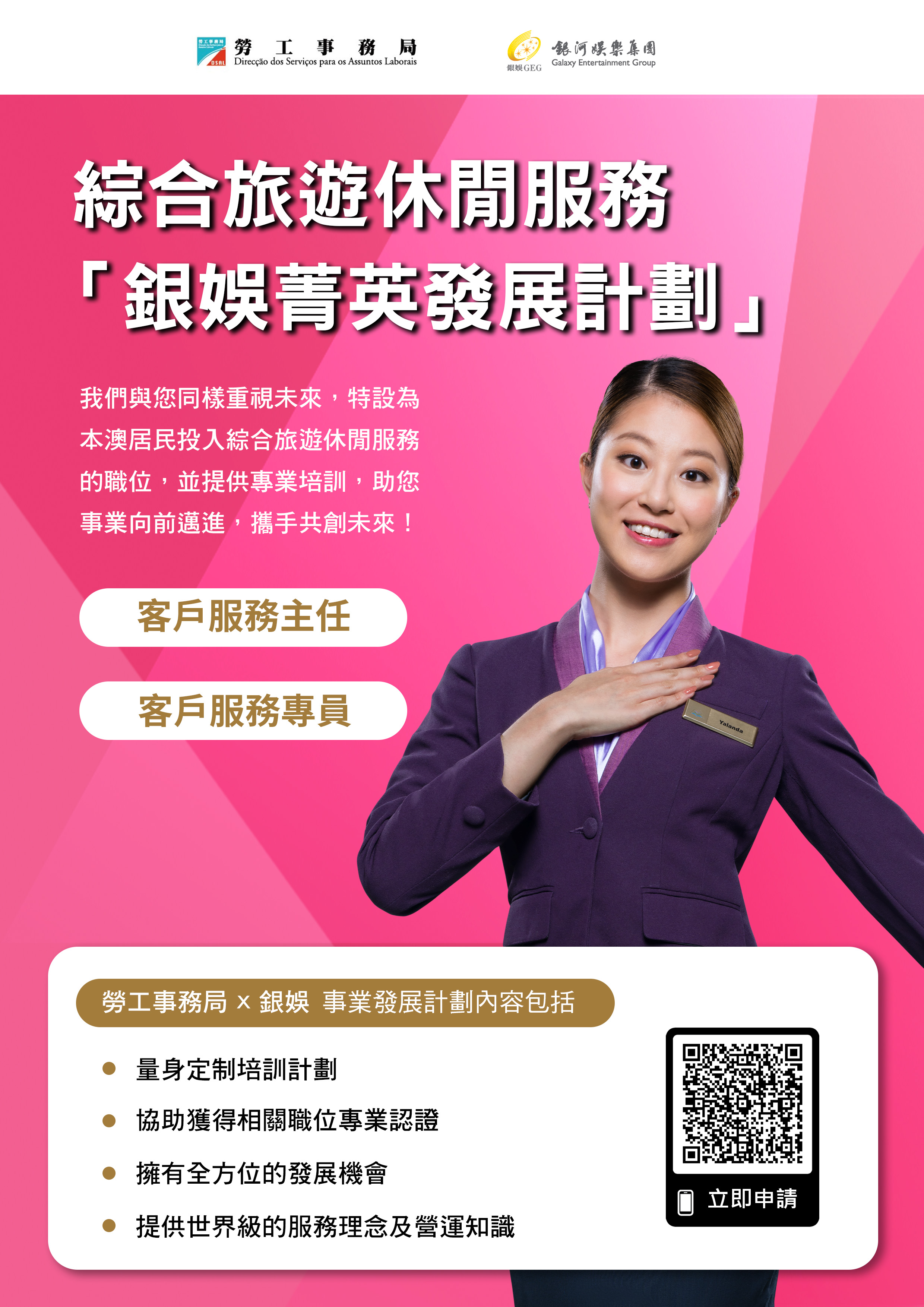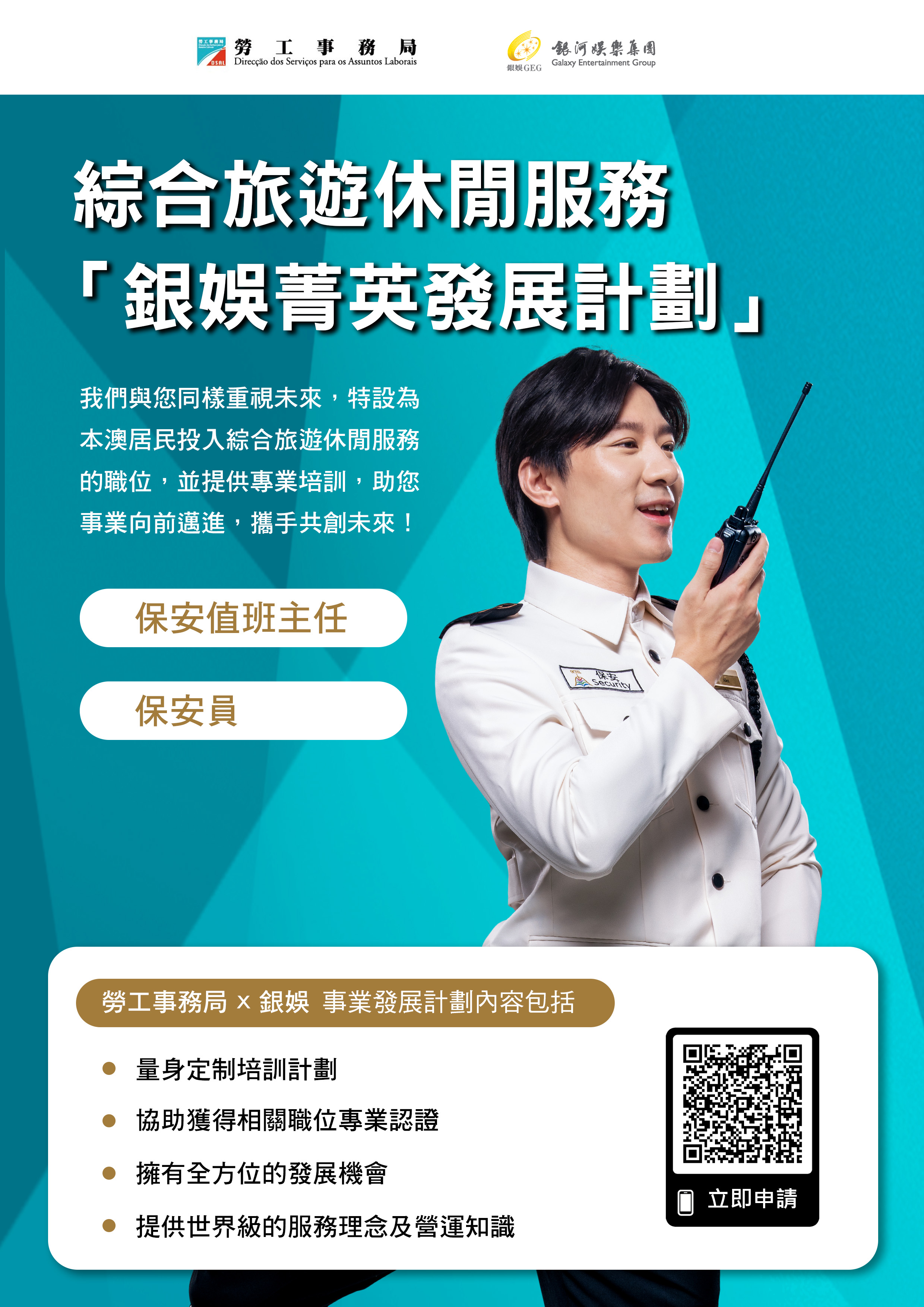 為支持本地人才全面發展,拓展多元職涯路向,勞工事務局和銀河娛樂集團(下稱“銀河娛樂")合作推出「銀娛菁英發展計劃(綜合娛樂服務範疇)」及「銀娛菁英發展計劃(保安服務範疇)」,以“先入職、後培訓”方式,為有志投身綜合旅遊休閒服務行業的澳門居民提供全方位培訓及事業發展機會,計劃由4月17日起接受申請。