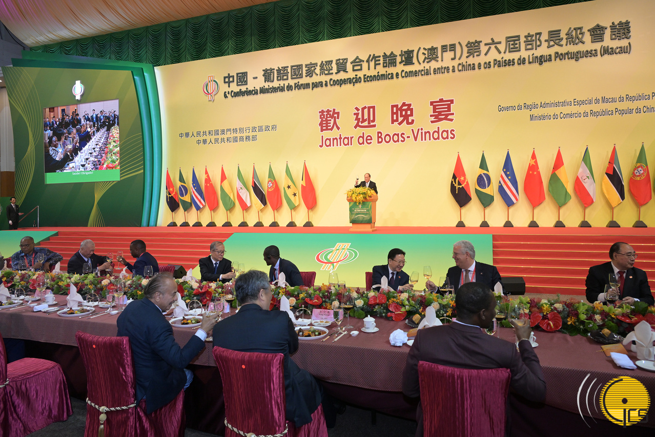 中國—葡語國家經貿合作論壇(澳門)第六屆部長級會議歡迎晚宴今(21)日晚上在澳門東亞運動會體育館國際會議展覽中心舉行,中共中央政治局委員、全國人大常委會副委員長李鴻忠,以及各葡語國家領導人及代表團團長出席,行政長官賀一誠及國家商務部部長王文濤分別致辭。