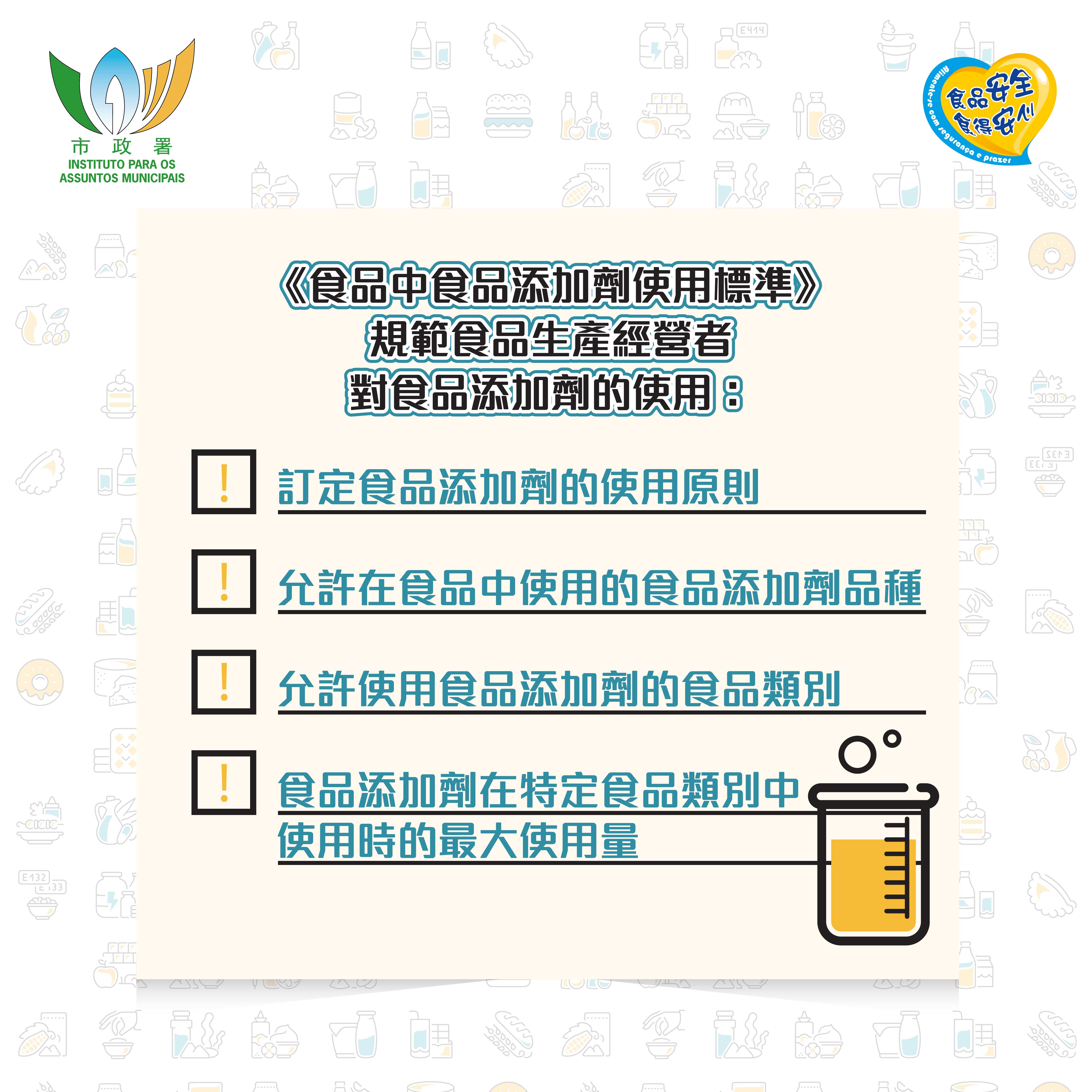 新生效的《食品中食品添加劑使用標準》除整合及更新舊有針對食用色素、甜味劑、防腐劑及抗氧化劑的三項食品安全標準,亦新增規範乳化劑、酸度調節劑、穩定劑、抗結劑、增味劑、保色劑等本澳食品中常見的食品添加劑。同時,擴大規範種類至約四百種,並新增數千項食品添加劑組合及其相應的最大使用量指標,更好地指導及規範業界對食品添加劑的使用。