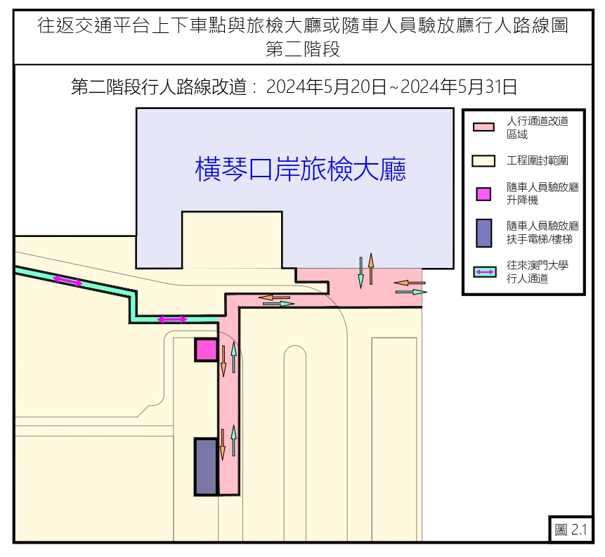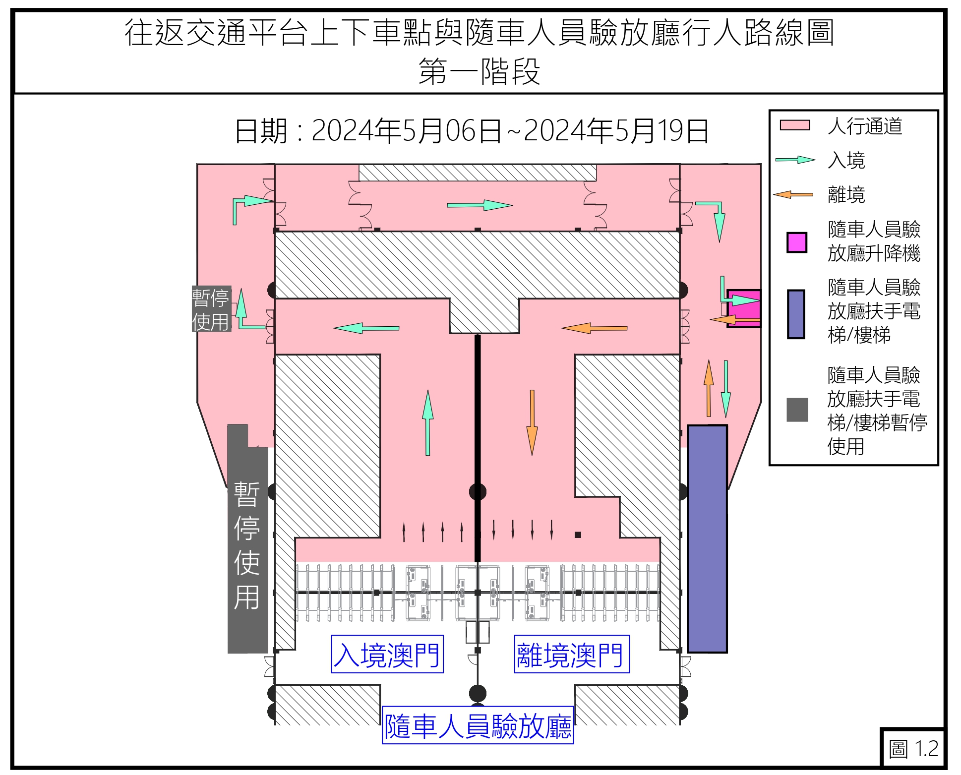 1. 由5月6日起至5月31日,旅檢大廳出入口之扶手電梯及升降機將分階段臨時封閉,行人可留意現場有關標識標示牌的指示,來往旅檢大廳及上落客點;經由隨車人員驗放廳入境澳門之隨車人員,需按照有關標識牌指示,步行至指定升降機或扶手電梯前往二層上落客點候車,詳細路線見圖1.1、1.2及圖2.1、2.2;