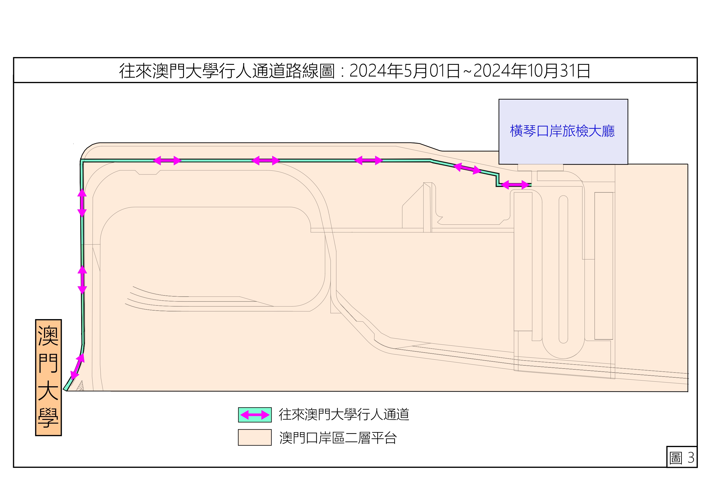 2. 由5月1日起至10月31日,澳門大學連接橫琴口岸前往旅檢大廳之行人專道,在到達橫琴口岸二層平台後之改道路線見圖3,行人應留意現場指示,避免進入施工圍封區域;