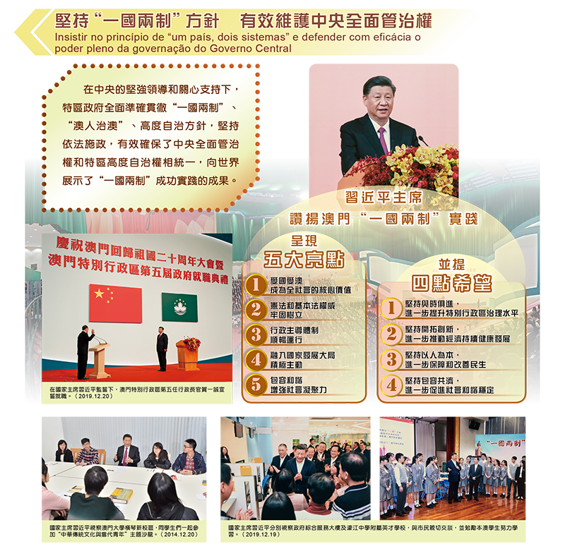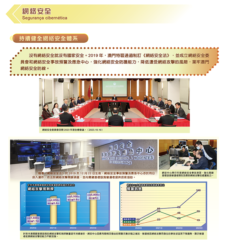 今年4月15日是我國第九個“全民國家安全教育日",澳門特別行政區政府與中央人民政府駐澳門特別行政區聯絡辦公室連續第七次舉辦“全民國家安全教育展”,截至5月3日,超過34,300人次進場參觀展覽,專題網站也錄得逾158,784次點擊瀏覽。本次展覽第三部分以“貫徹總體國家安全觀 切實維護各領域安全”為主題,並分為多個章節,包括“中央充分肯定澳門特區政府工作”、“堅持‘一國兩制’方針 有效維護中央全面管治權”、“經濟安全、金融安全”、“社會安全”、“文化安全”、“網絡安全”和“科技安全、生物安全、生態安全”。
