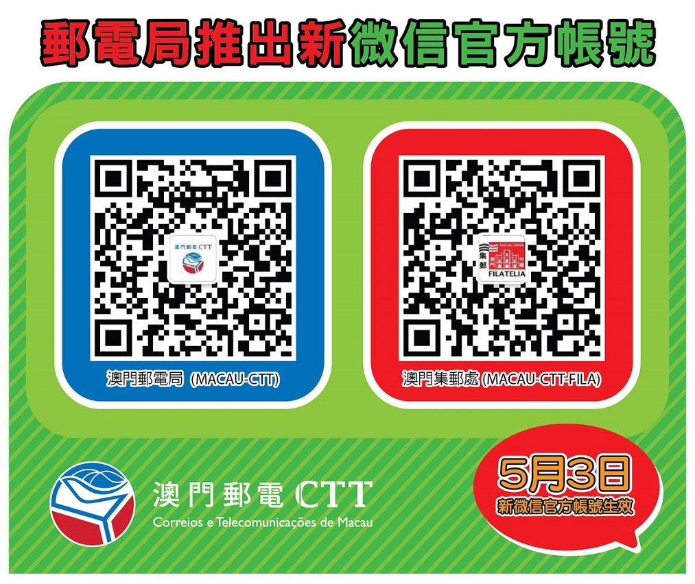 郵電局於5月3日推出兩個新微信官方帳號 “澳門郵電局(MACAU-CTT)”及 “澳門集郵處(MACAU-CTT-FILA)”。同時舊版微信帳號 “澳門郵電” 及 “澳門集郵” 將於5月17日起停止提供服務。敬請市民掃描二維碼並關注郵電局新微信官方帳號,以取得最新資訊。