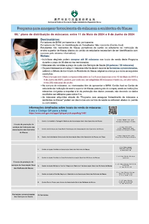 衛生局今(9)日公佈,第66輪保障口罩供應澳門居民計劃(下稱“口罩計劃”)於5月11日開始,具體如下: