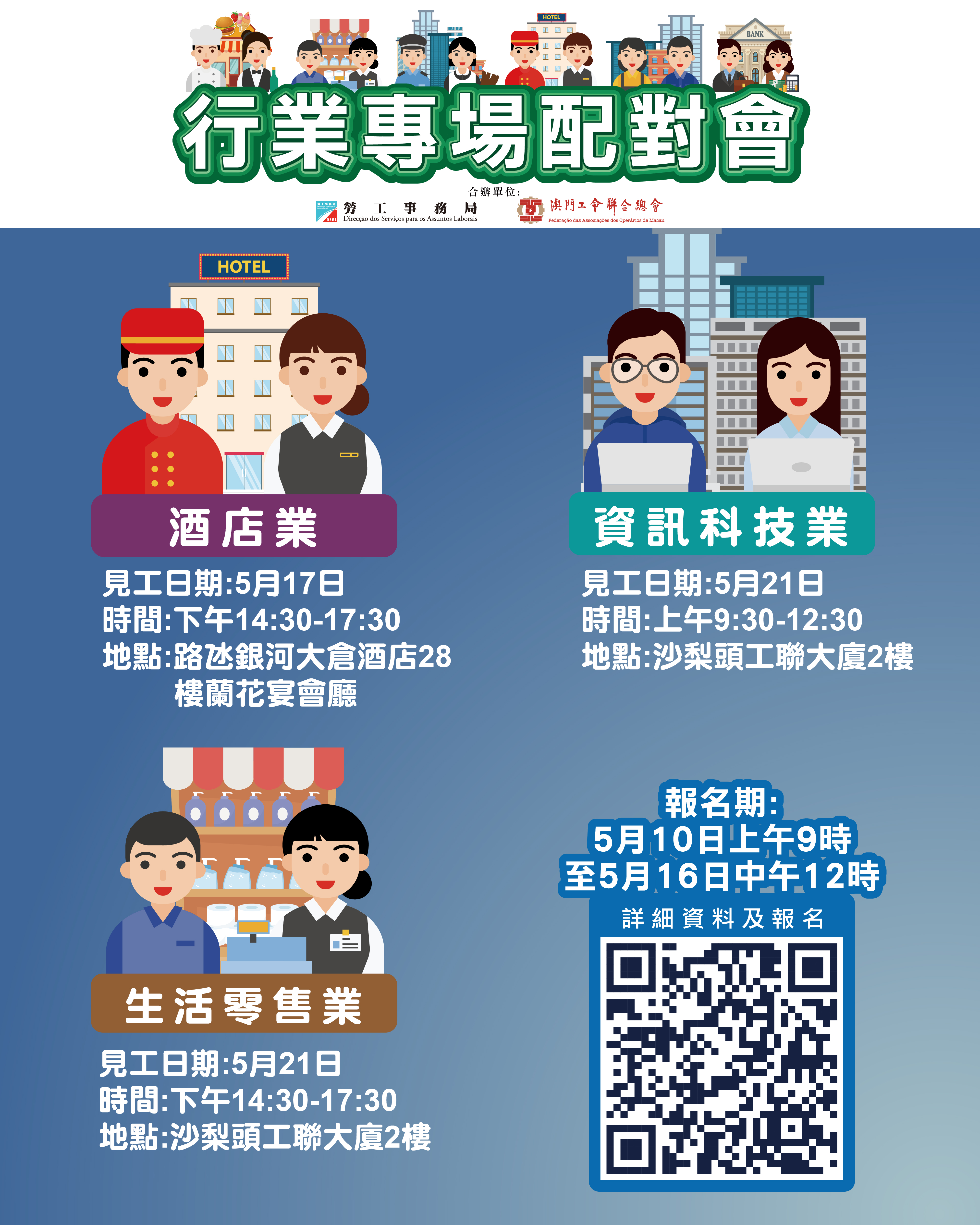 上述5月17日下午酒店業配對會在澳門大倉酒店28樓蘭花廳舉行;5月21日上午資訊科技業配對會及下午生活零售業配對會在澳門工會聯合總會二樓(沙梨頭海邊街2-6號工聯大)舉行。報名日期為5月10日上午9時至5月16日中午12時。