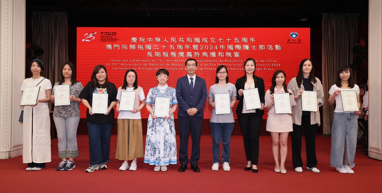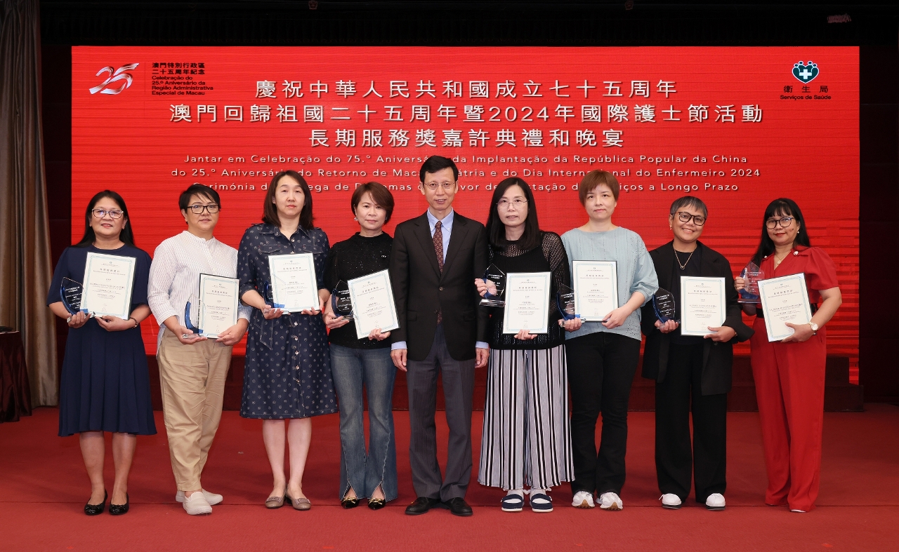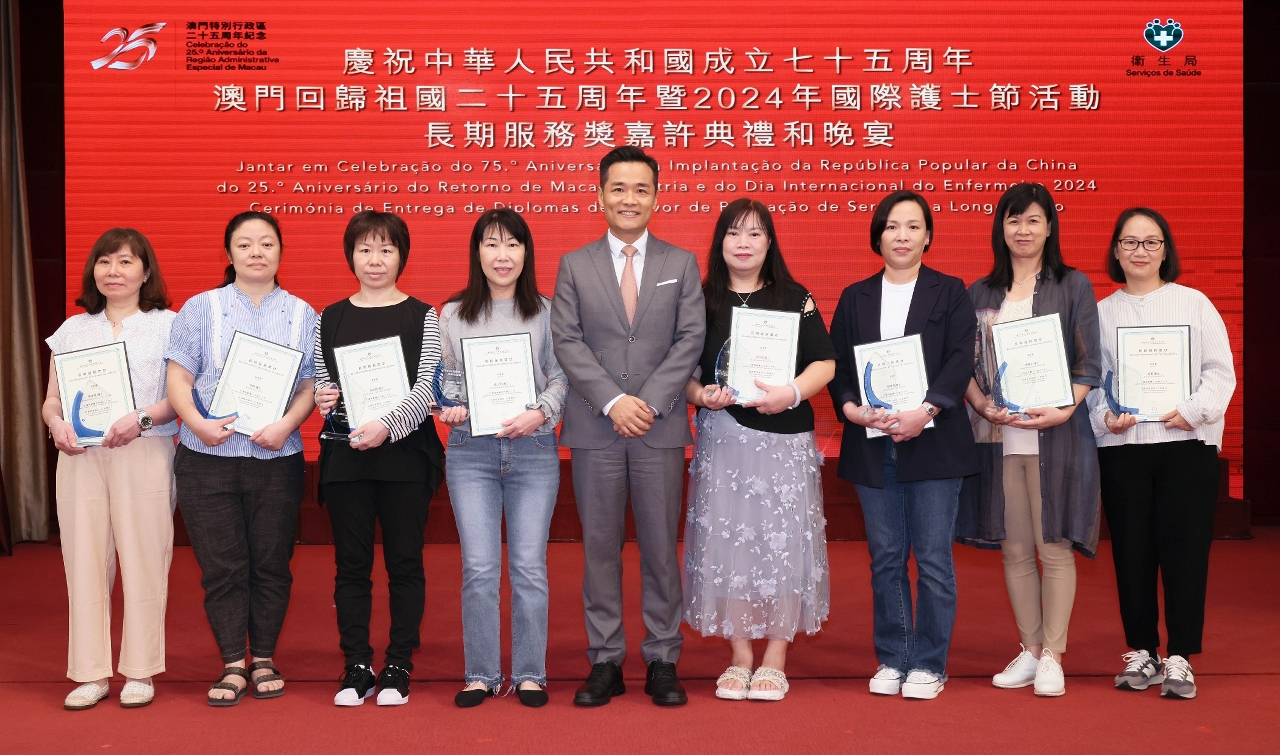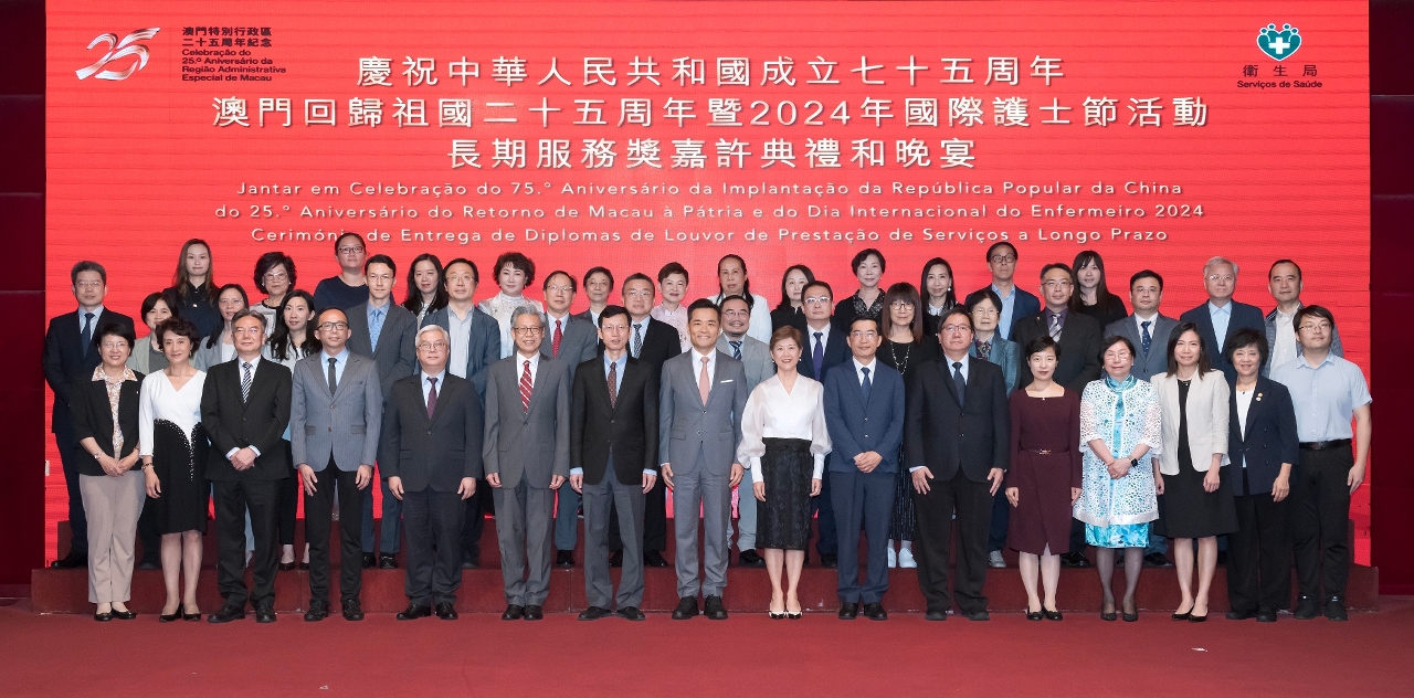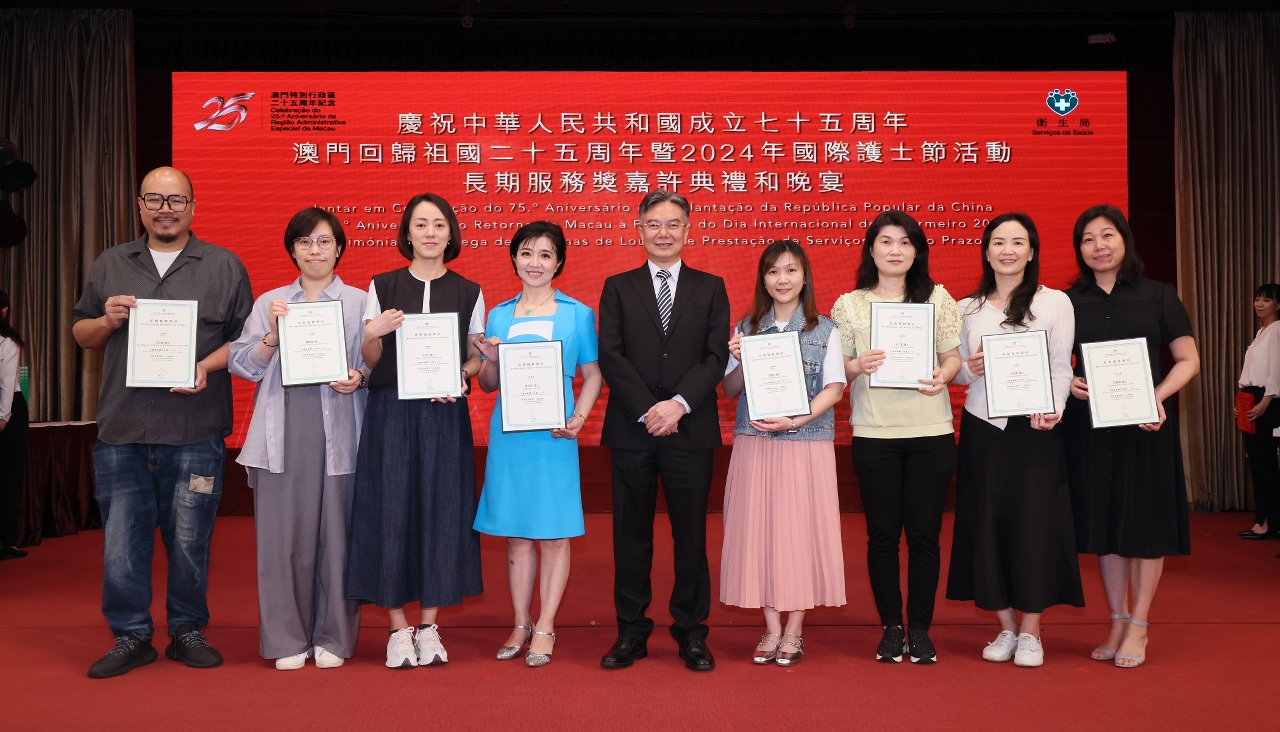 藉着2024年度國際護士節(即每年的5月12日),衛生局日前舉行了“慶祝中華人民共和國成立七十五周年、澳門回歸祖國二十五周年暨2024年國際護士節活動 - 長期服務獎嘉許典禮”。中央人民政府駐澳門特別行政區聯絡辦公室宣傳文化部殷汝濤副部長,澳門特別行政區政府衛生局羅奕龍局長、郭昌宇、鄭成業、陳永華副局長等出席了活動並擔任頒奬嘉賓,嘉許了服務滿20年、30年的60位護士,以示特區政府肯定和讚揚其對護理工作的貢獻。