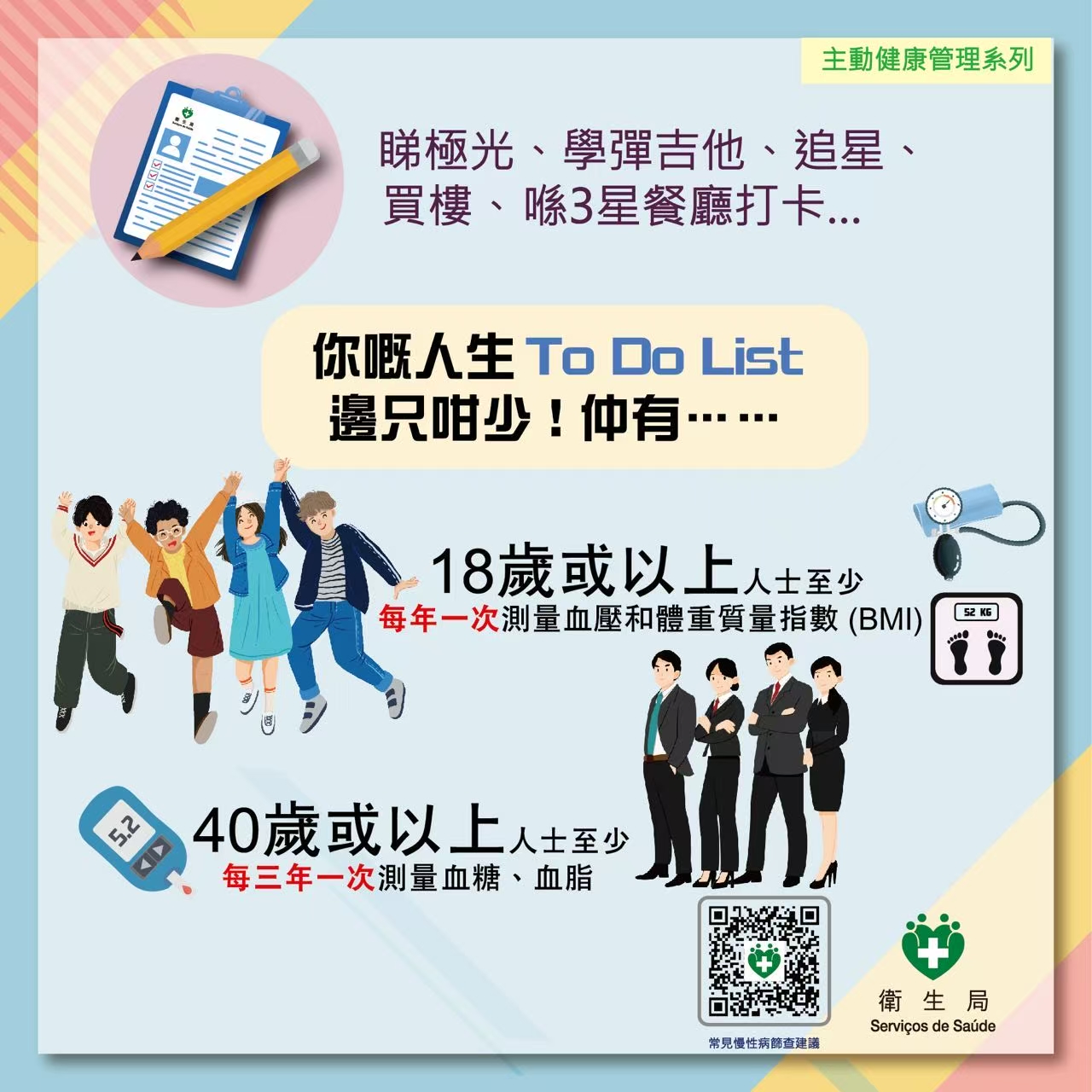 衛生局秉持“預防優先,妥善醫療”的理念,透過制定健康政策、創設健康環境和促進個人健康行為,以達致構建健康澳門的目標。為喚起居民關注血壓問題、加強主動管理自己健康,尤其提升年輕族群對測量血壓的關注度,並配合“世界高血壓日”於5月17日舉辦“5.17血壓齊齊check”活動,具體如下: