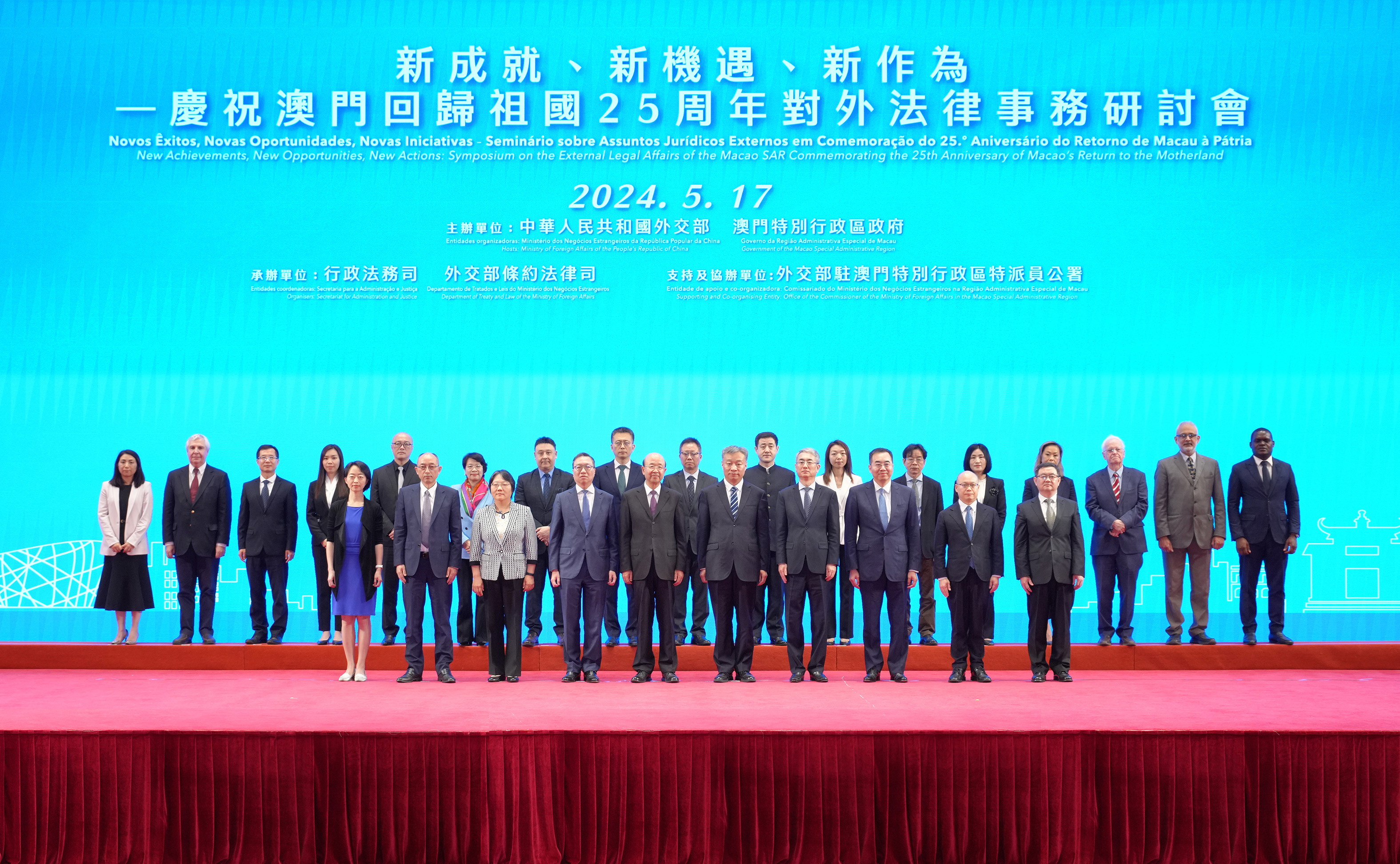 為慶祝澳門回歸祖國25周年,澳門特區政府與外交部今(17日)在澳門共同舉辦“新成就、新機遇、新作為——慶祝澳門回歸祖國25周年對外法律事務研討會”。外交部部長助理苗得雨、澳門特區政府行政法務司司長張永春、香港特區政府律政司司長林定國出席開幕式並致辭,聯合國副秘書長兼聯合國法律顧問蘇亞雷斯在開幕式視頻致辭。外交部駐澳門特區特派員公署特派員劉顯法出席開幕式。