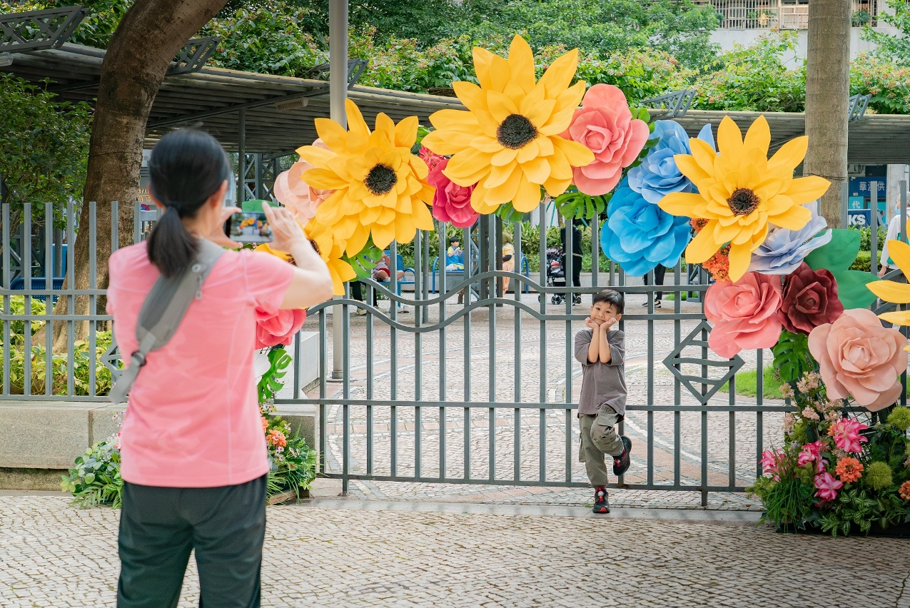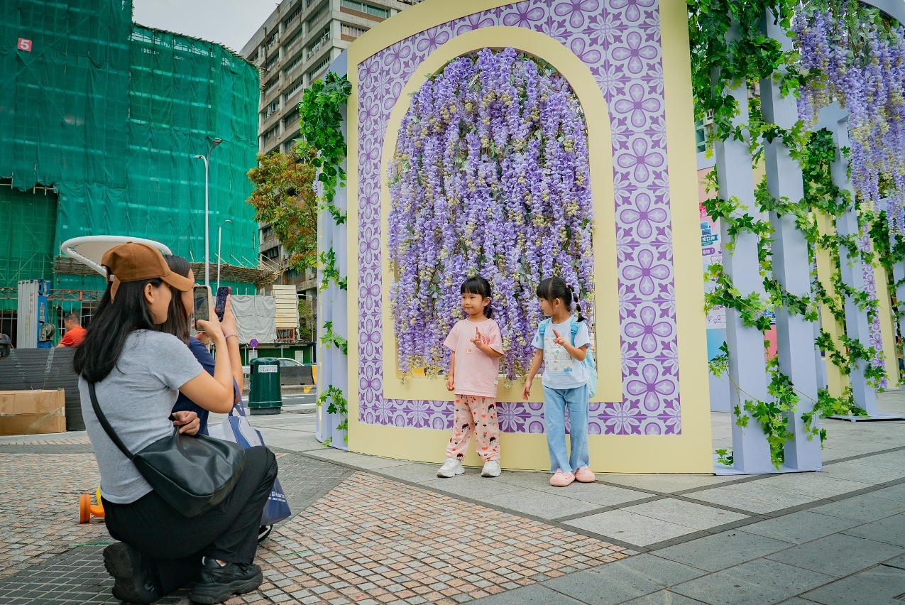 繼4月底推出“綠野迷蹤”及“願望花廊”兩組大型打卡裝置後,今(22)日再推出兩組新裝置,分別是設於黑沙環公園圓形地的“奇夢拱築”裝置,以太陽花為主題打造出充滿活力的巨型花拱門;以及設於筷子基北灣休憩區的“細說花語”裝置,以紗簾般垂下的紫藤花打造成區內休憩和打卡好去處,讓市民和旅客從生活中放慢腳步,感受悠然愜意的一刻。