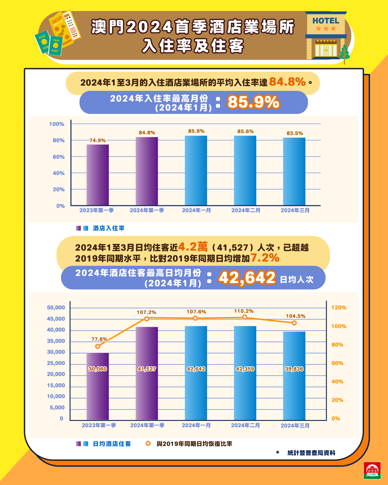 酒店業場所入住方面,2024年第一季酒店平均入住率錄得84.8%,較2023年同期上升9.9個百分點,而較2019年的91.9%僅差7.1個百分點。酒店住客數目恢復更為顯著,2024年第一季錄得377.9萬人次,較2023年同期上升39.7%,較2019年同期上升8.4%。