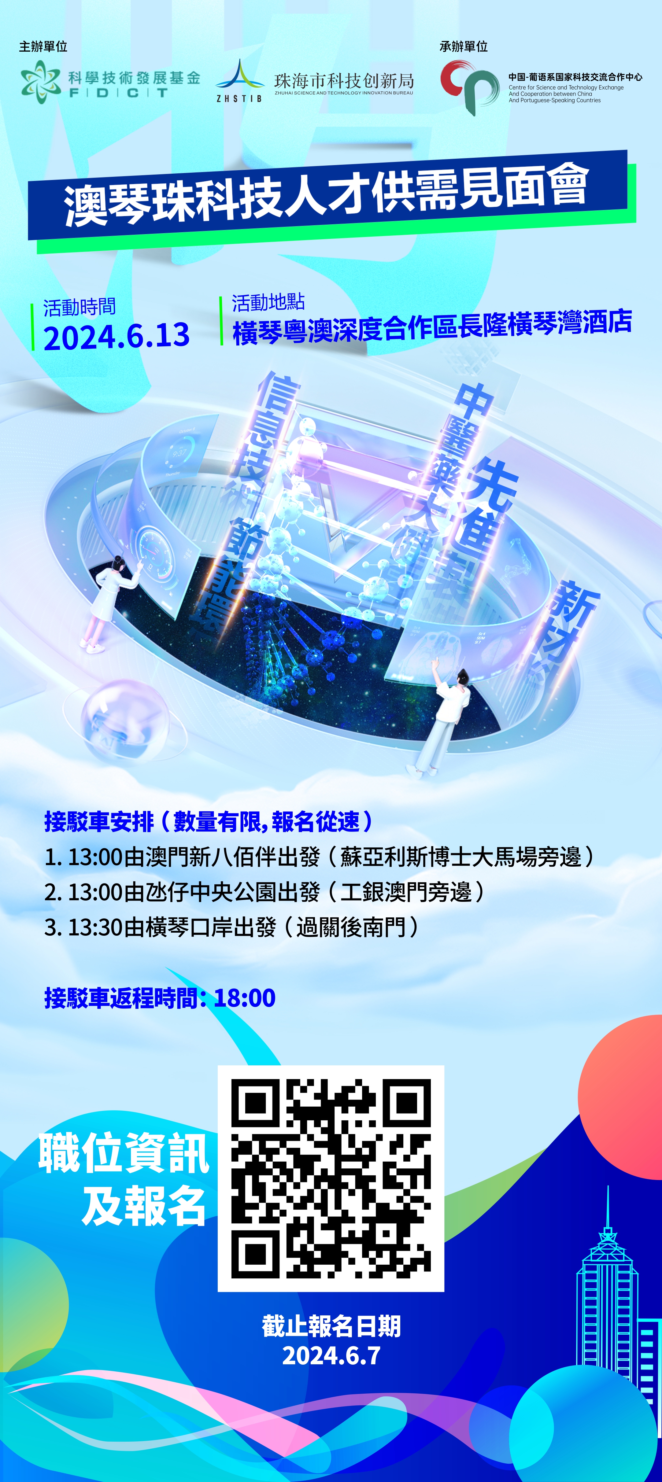 活動將於6月13日於橫琴粵澳深度合作區長隆橫琴灣酒店舉辦,參與企業由下午2時30分至6時擺設招聘攤位,歡迎全澳高校學生及青年帶備個人履歷到現場進行就業配對。為便利參與者往來會場,將於澳琴三個地點安排接駁車輛,詳情請參閱活動海報或報名系統(網址:https://www.fdct.gov.mo/zh_tw/recruit.html或掃瞄QRcode)。有意參與者可於6月7日或之前透過報名系統瞭解職位資訊及進行報名,由於接駁車輛數量有限,敬請報名從速。如有查詢,可於辦公時間致電科技基金項目成果轉化及輔助部85998184(賀先生)。